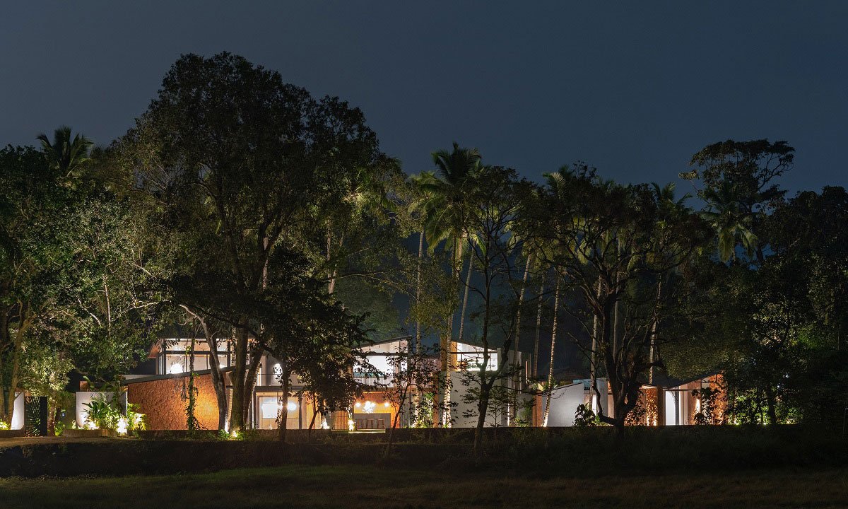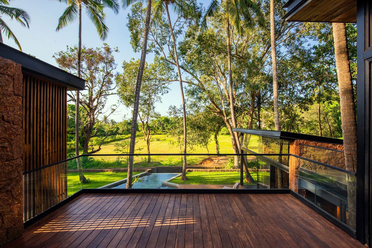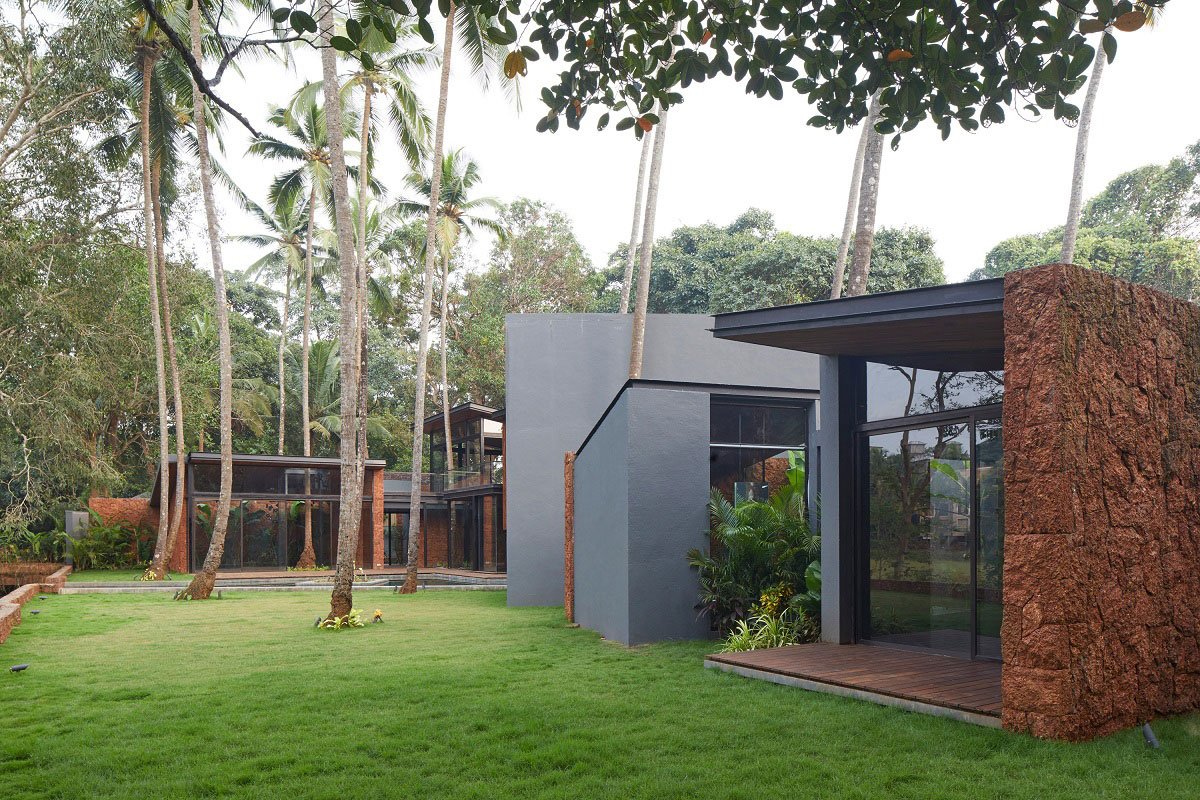 The building design adopts distinct local features and materials of the tropical coastal state of Goa, with exposed local laterite stone walls, sloping roofs and screens made from 100-year-old recycled teak wood, while the landscape design consists of local tropical species (mostly various types of palms) that maintain their lush greenery through the year.