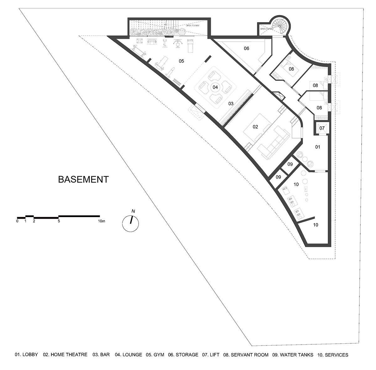 [Text as submitted by architect] The design was required to be maximized in terms of green spaces and multiple views to the adjacent park. The site stands surrounded by villas on all 3 sides thereby leaving one side to open up the house to the views of the park. Three of the existing trees and two more trees in a flanking condition were to be retained any which way. Dual interaction zones- like zones of privacy for the nuclear families and the zones that enable the whole family to get together and interact in a single room was also a client requirement alongside the Home theater, bar and gym in the basement connected with a nice outdoor staircase and a patio to bring in light.