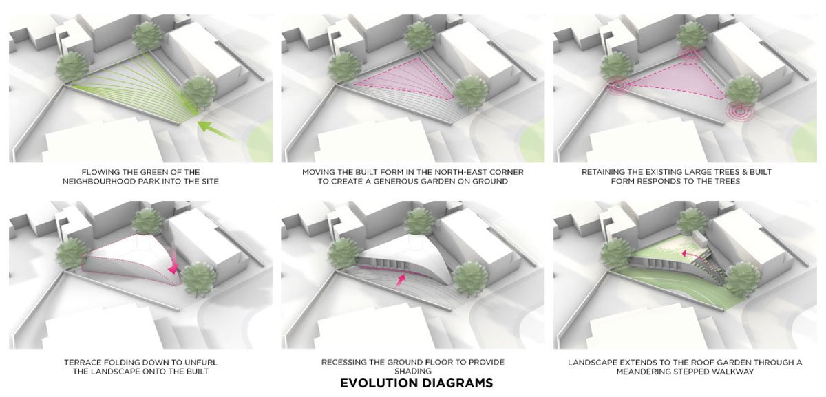 The odd shape of the plot along with the views of the neighborhood park was used as design drivers. Thematically the design looks at flowing the green of the neighborhood park in the site, with streamlines emerging from the park facing the southern side and opening up towards the northern edge of the site. This base grid has been used to define the built-form and landscape zones such as water bodies, hardscape and soft scape.