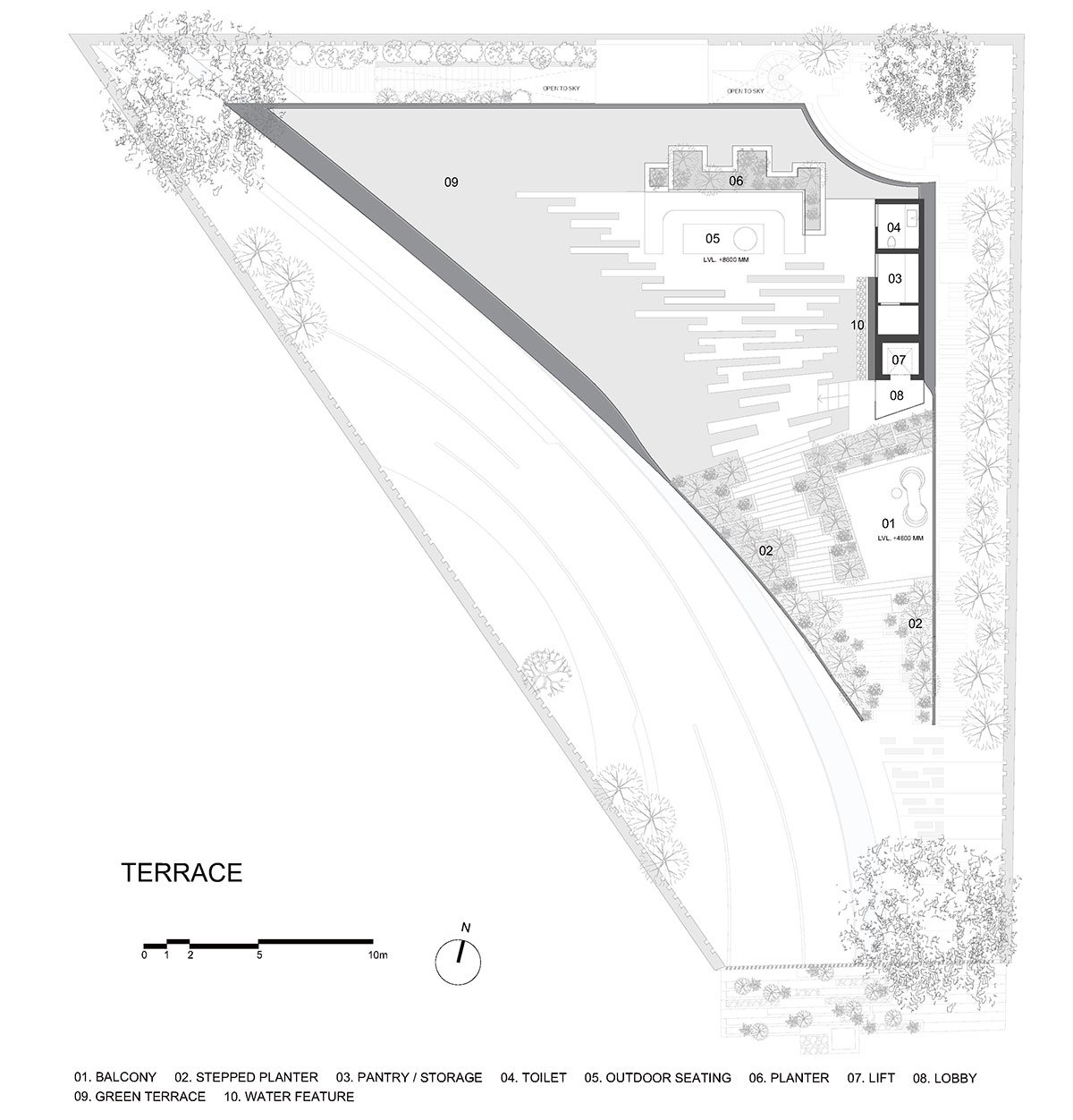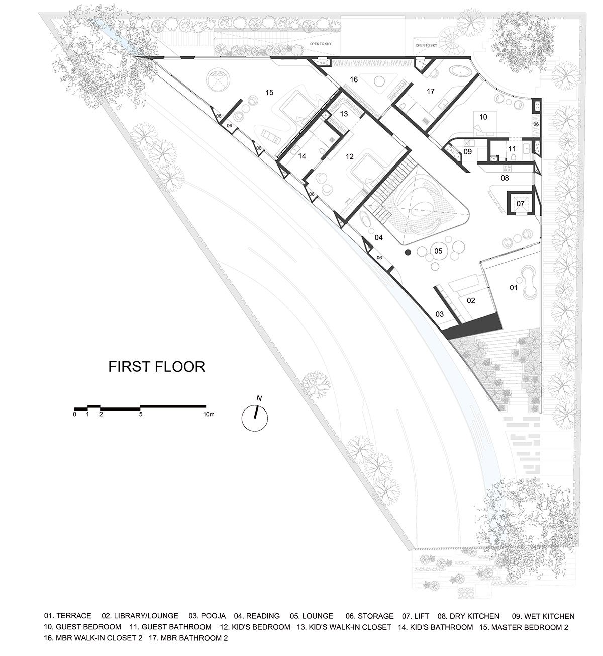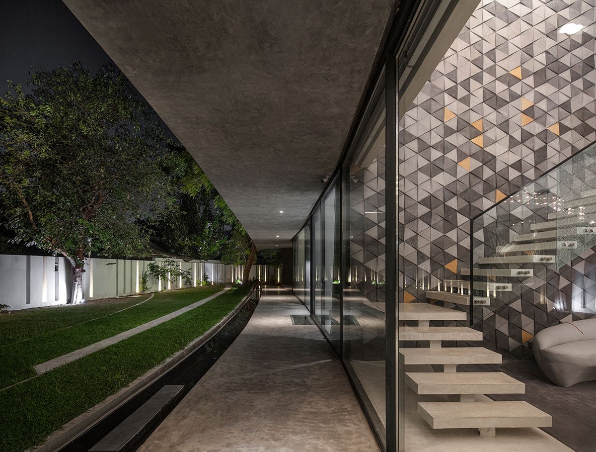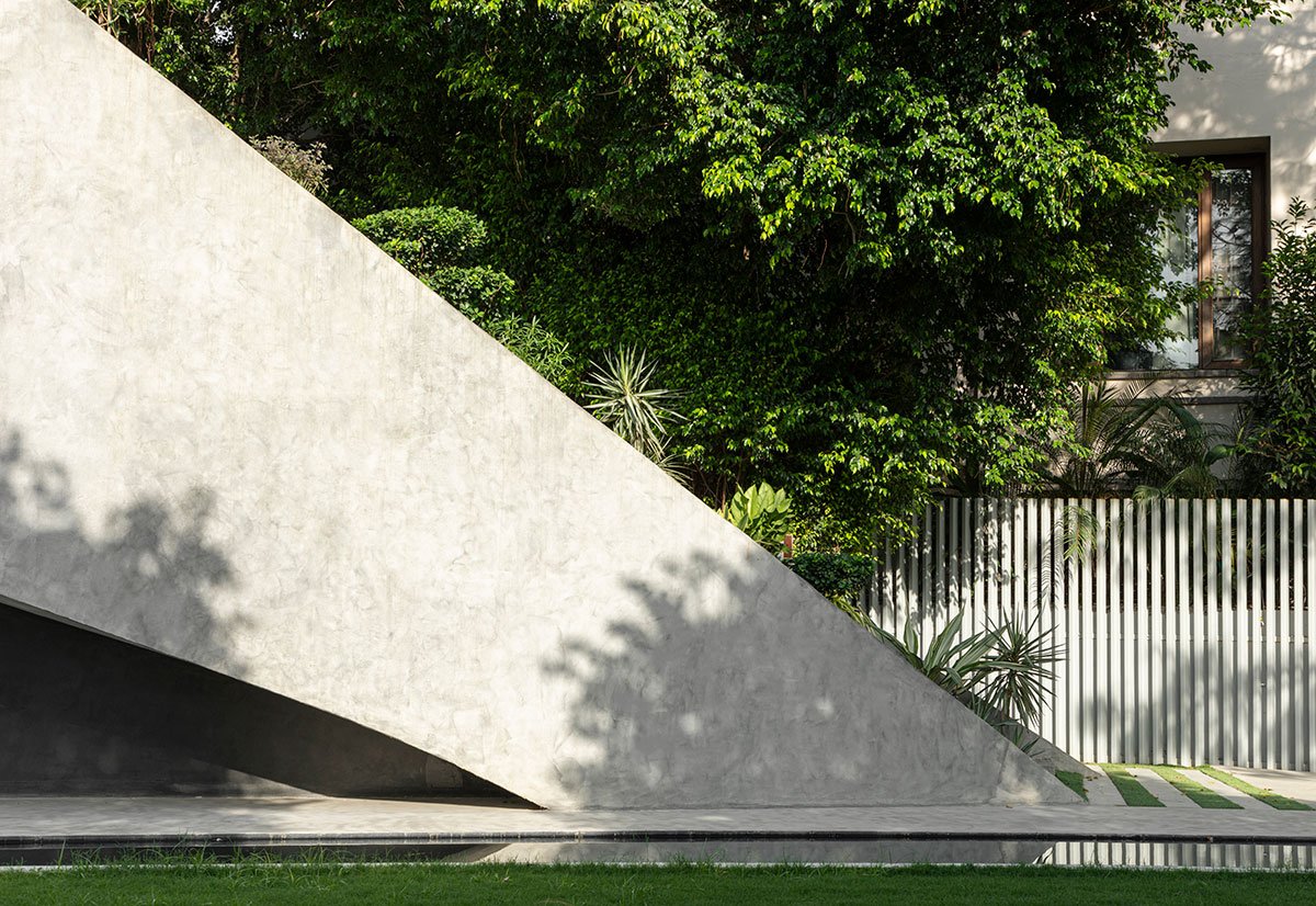 The built form is strategically placed on one edge of the site, resulting in a generous landscaped garden on the west side of the plot which opens up to the double-height family living & dining, thereby extending as an outdoor living room. The built form emerges from the landscape and blends the ground floor to the roof of the building, creating an outdoor connective spine for the villa. This meandering stepped walkway has an outdoor space on the first floor with outdoor shaded seating and connects further to the terrace.