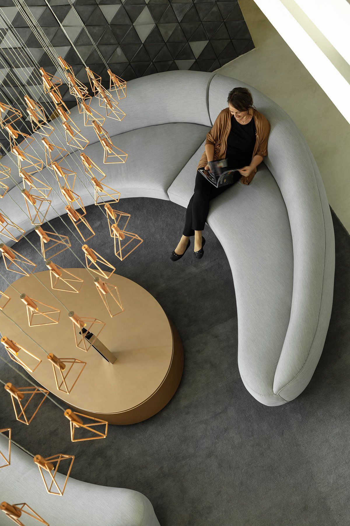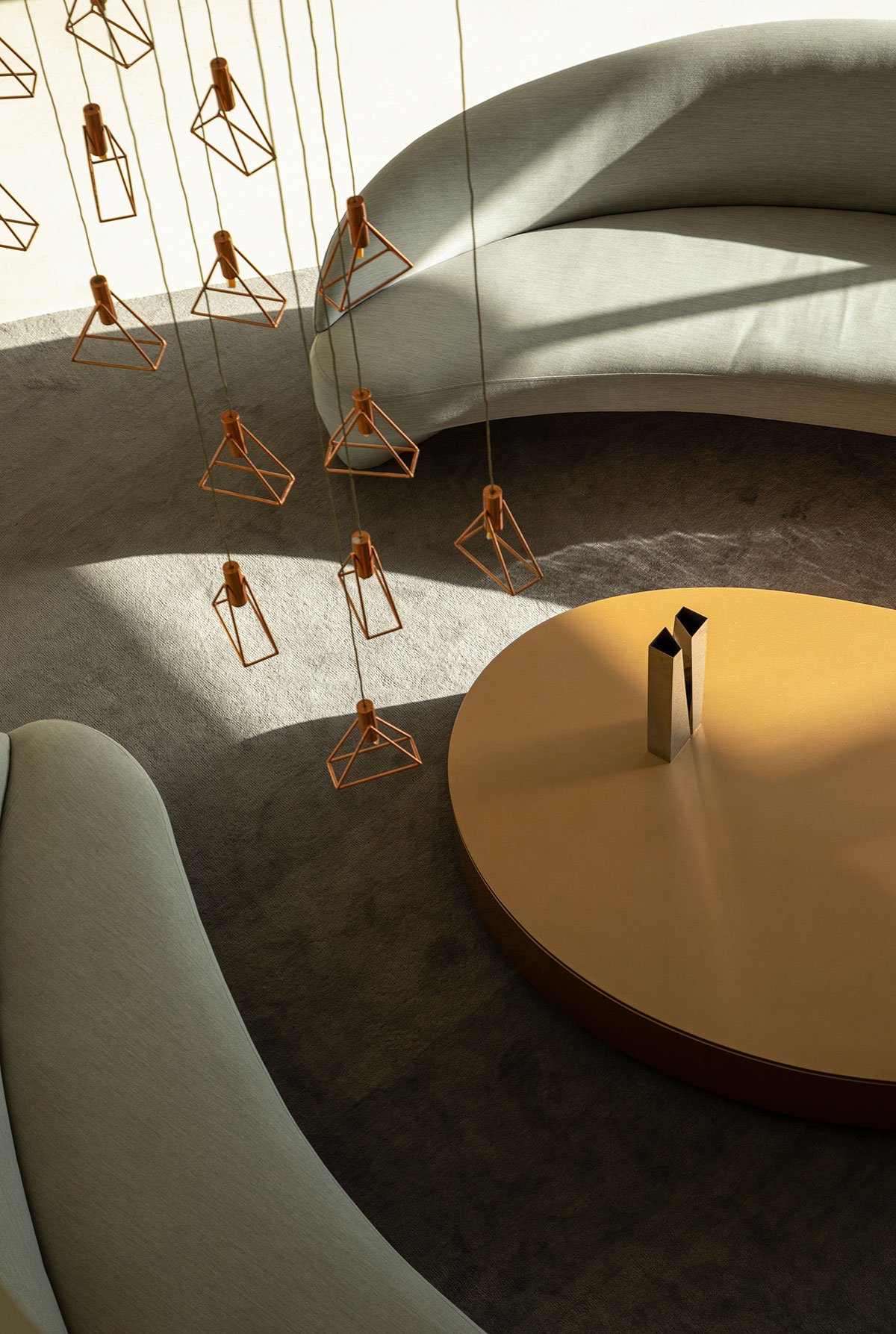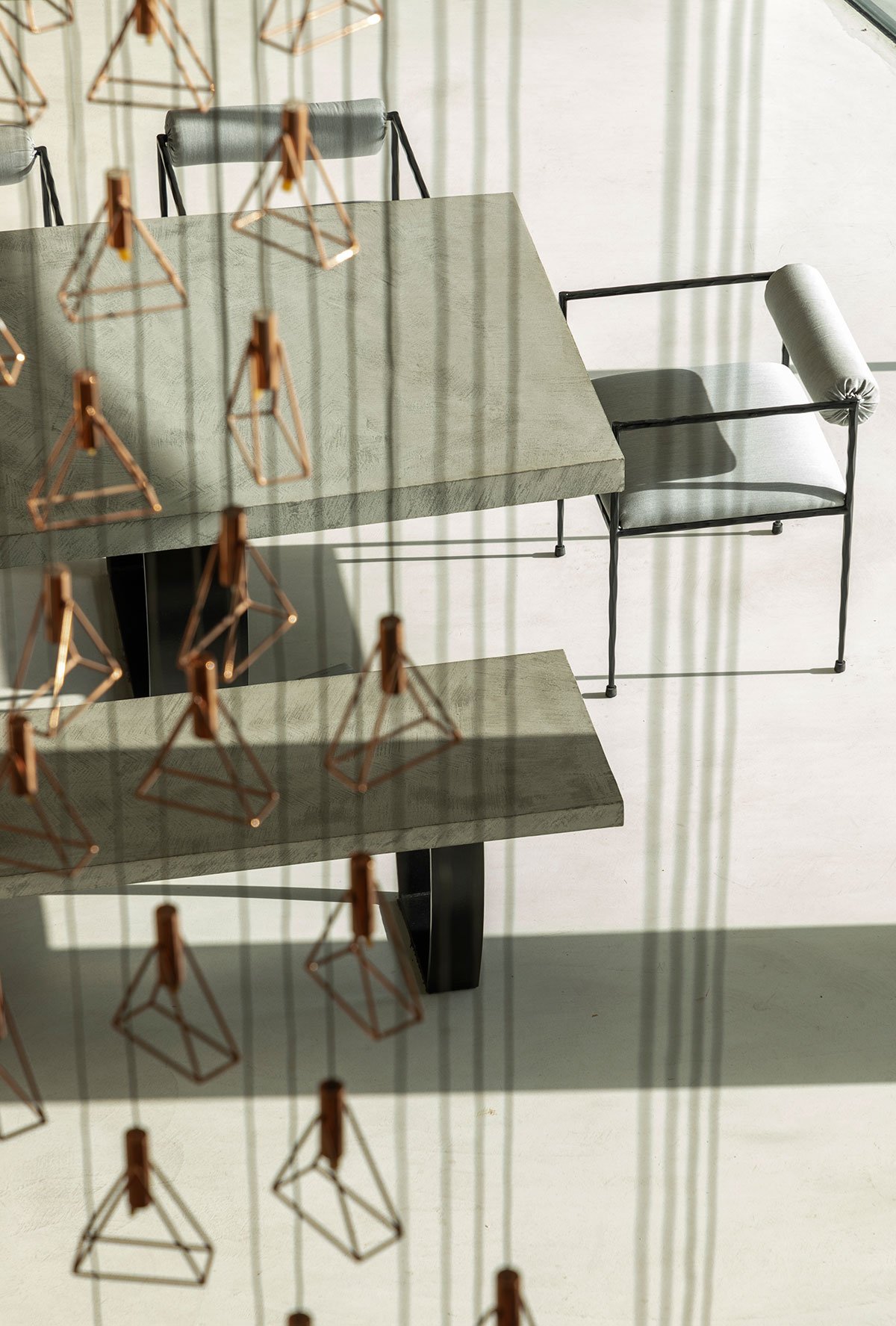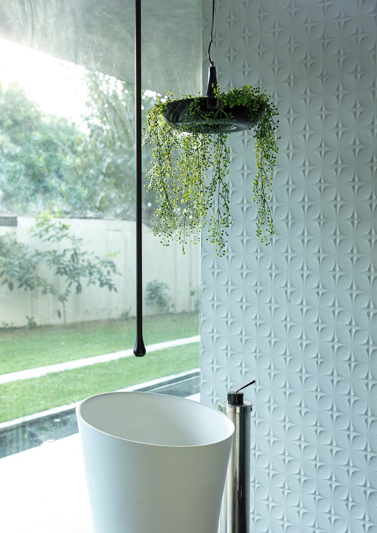 The built form is strategically placed on one edge of the site, resulting in a generous landscaped garden on the west side of the plot which opens up to the double-height family living & dining, thereby extending as an outdoor living room. The built form emerges from the landscape and blends the ground floor to the roof of the building, creating an outdoor connective spine for the villa. This meandering stepped walkway has an outdoor space on the first floor with outdoor shaded seating and connects further to the terrace.