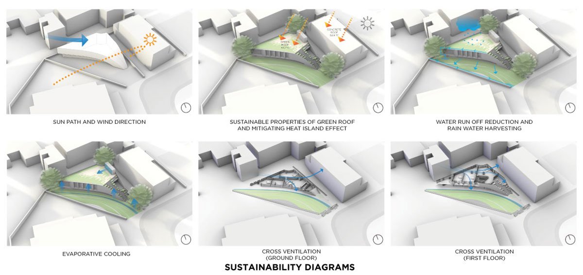 Sustainable design strategies have been inculcated in the design, to create ambient indoor and outdoor spaces. The ground floor has a deep cantilever on the southwest and east facing façade on the ground floor to cut the harsh summer sun. Water bodies are provided on the ground floor and terrace to promote evaporative cooling. The roof of the building is a landscaped terrace with earth and grass, this helps further to cut down the direct heat gain of the villa.