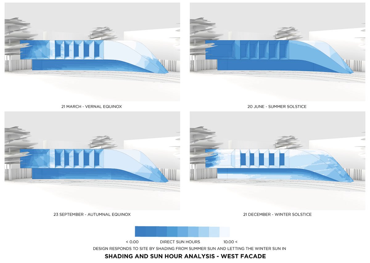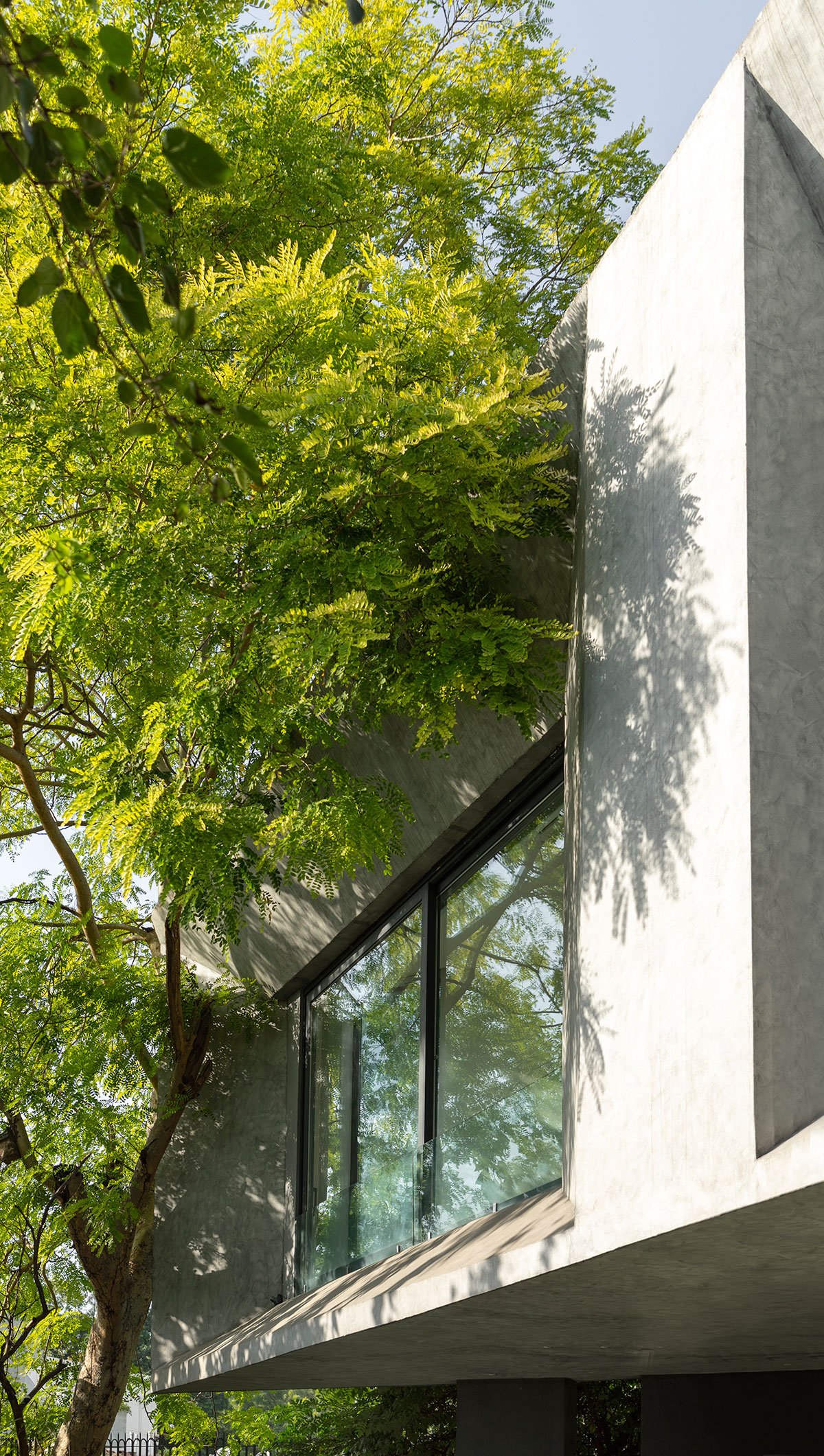 Design intent was to create a dichotomy in the façade with the lower façade being light in nature and a heavy volume floating on top of it. The ground floor has a glass façade to connect with outdoor green spaces, and the first floor has punched windows carved out of concrete to minimize heat gain as this façade is directly exposed to the sun.
