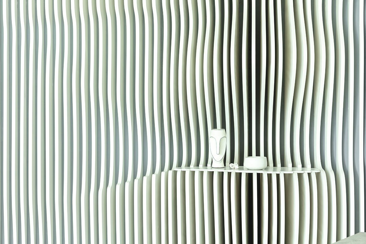 Given the hot climatic conditions of Delhi-NCR this project has been designed for human comfort both indoors and outdoors. The shallow water body on the ground floor has been placed in the path of the wind direction, helping in evaporative cooling. The main southwest-facing facade on the ground is recessed to block the direct sunlight during the day, yet maintain a seamless visual connection to the outside. In the early evening, some rays of sunlight animate the interior. The upper floor of the building is made of concrete with windows recessed back to cut the south sun.