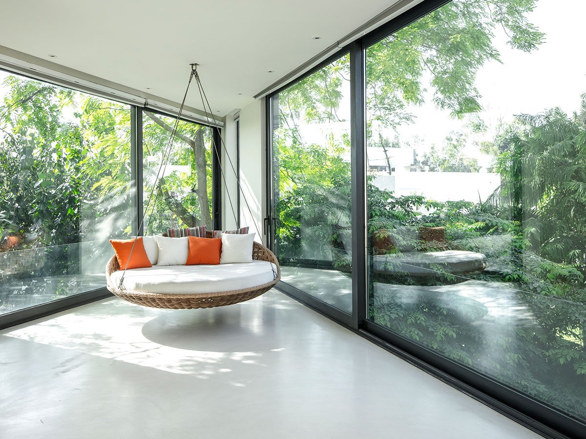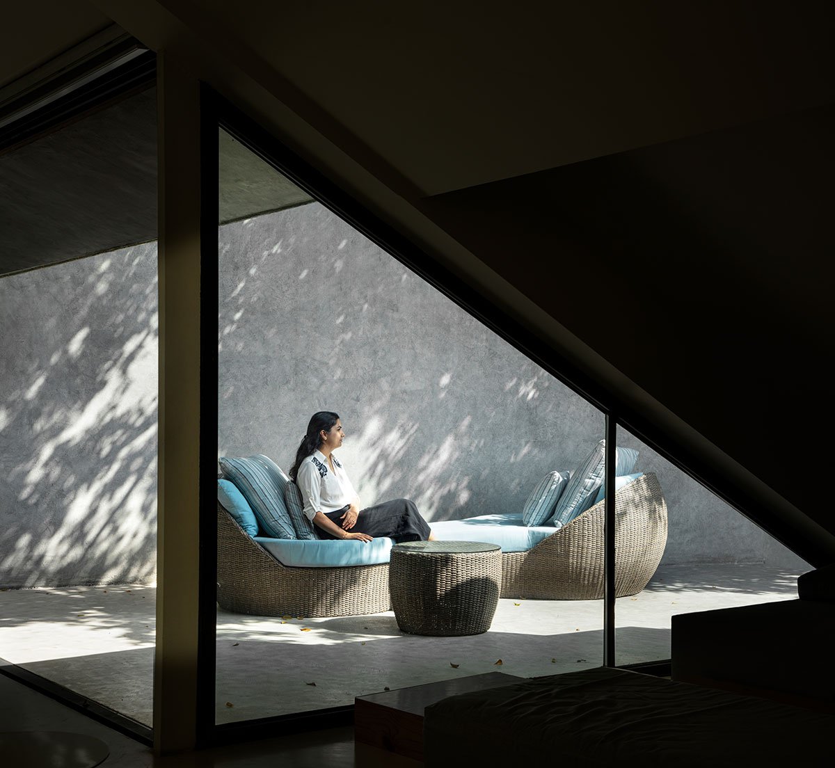The three existing trees on site have been retained, creating zones of shadow in the landscape and also help in reducing the sun exposure of the villa. The green cover on the terrace as well as the meandering steps, ensure a reduction of direct heat gain. Wind direction was taken into account for cross-ventilation in the house.