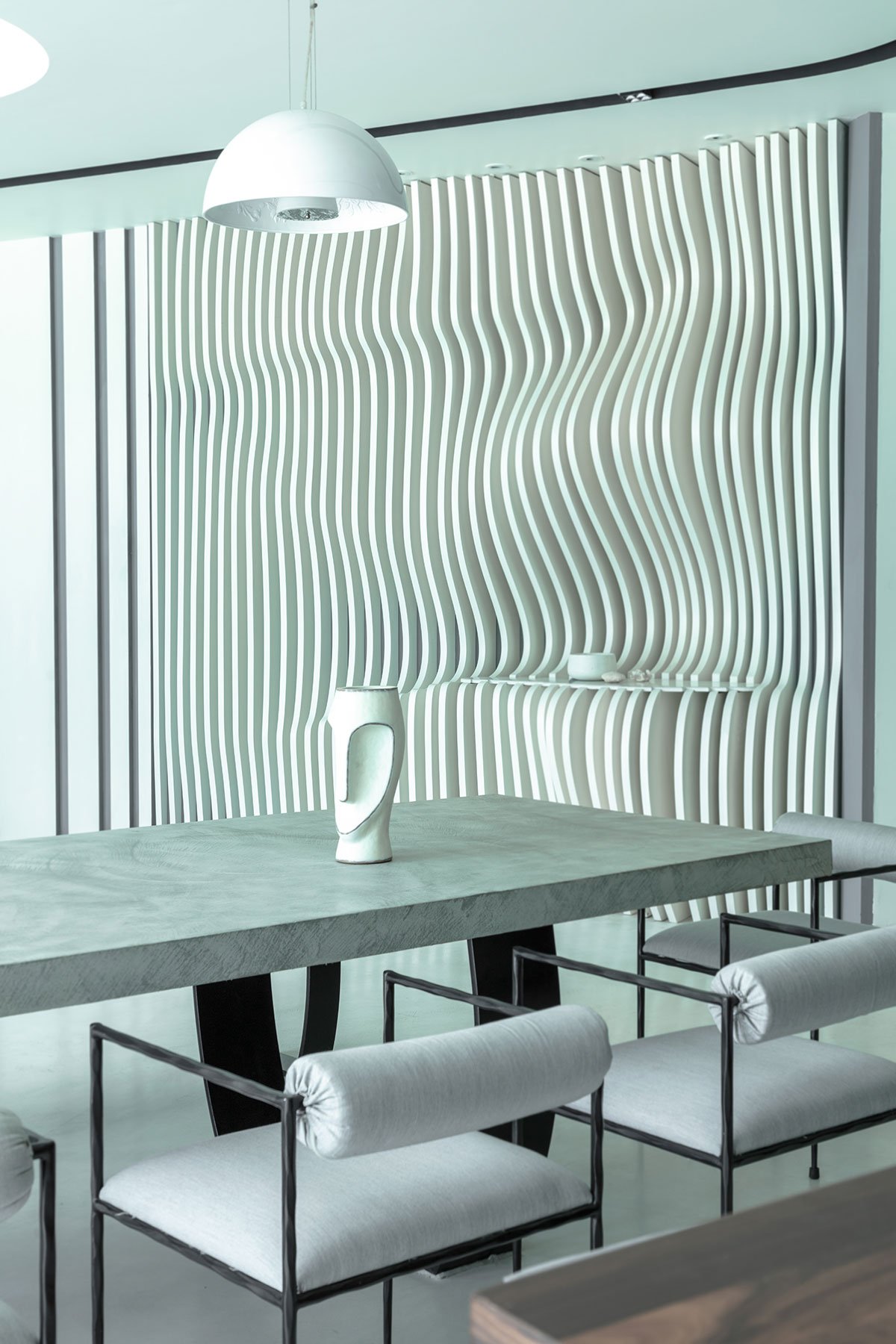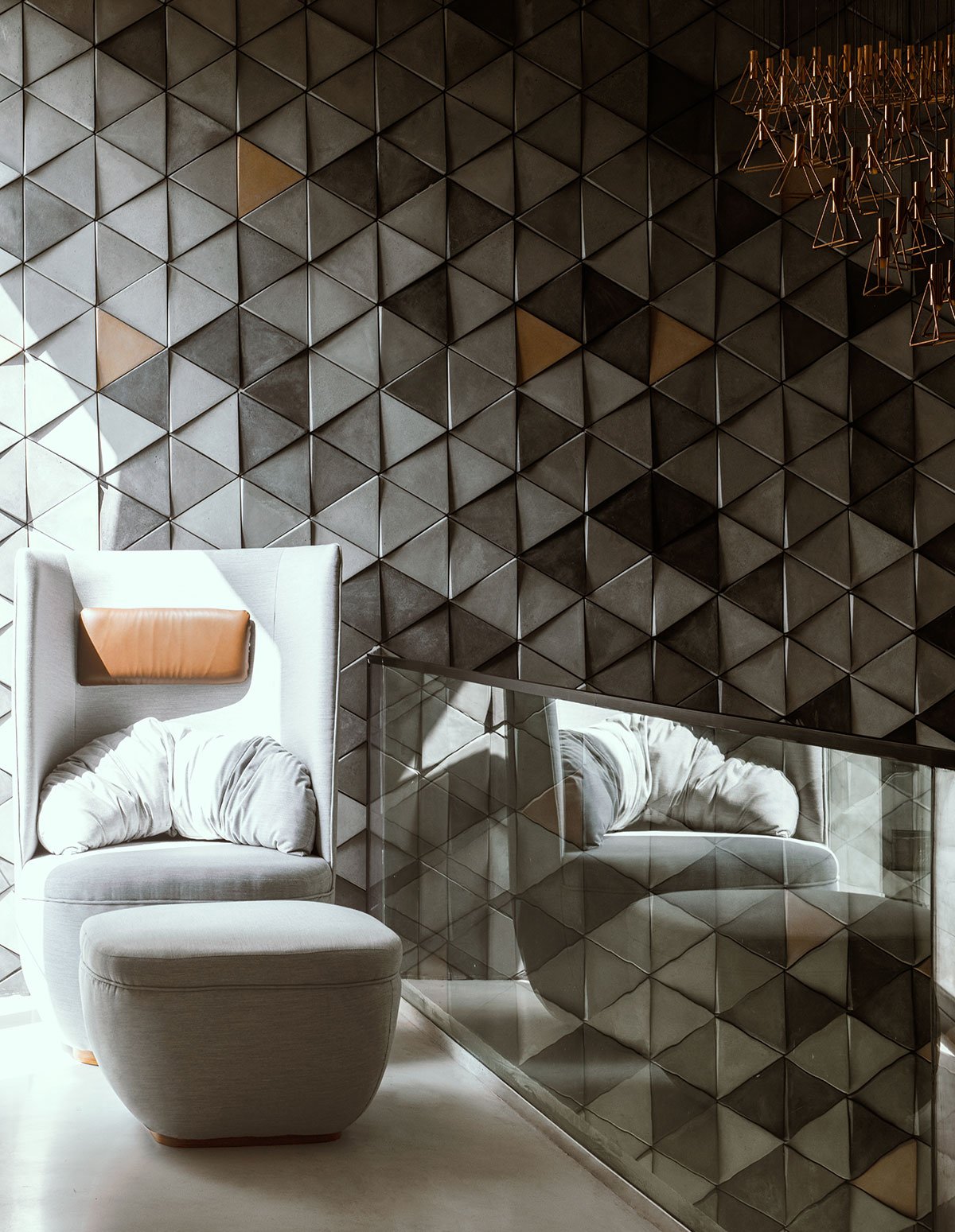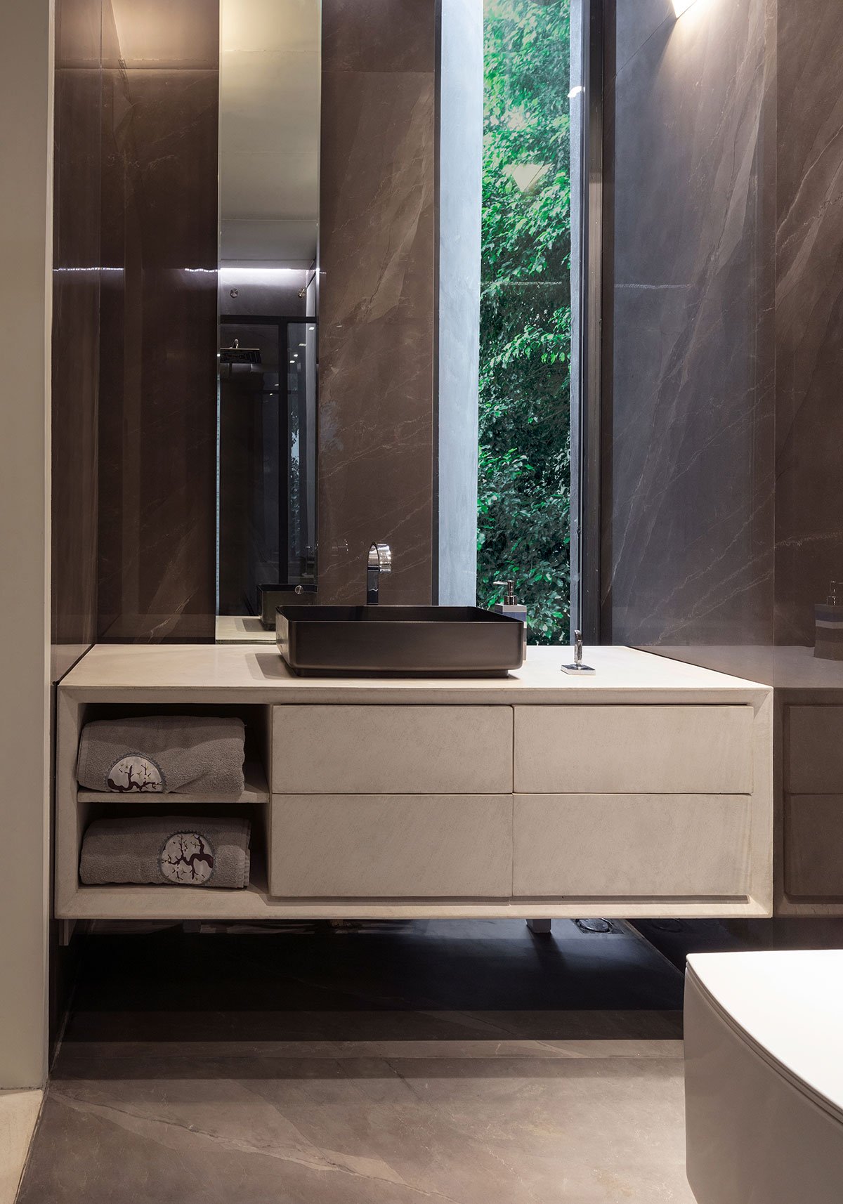In urban settings, there is a disconnect with nature. Through KD45, Studio Symbiosis wants to look at creating green urban living environments and rekindle the interaction with nature in their immediate surroundings. This villa emerges from the landscape, with the core idea to create a maximum green cover on-site and utilize the views of the park to its fullest. The built mass and the landscape blend into each other such that the indoor spaces open seamlessly into the greens.