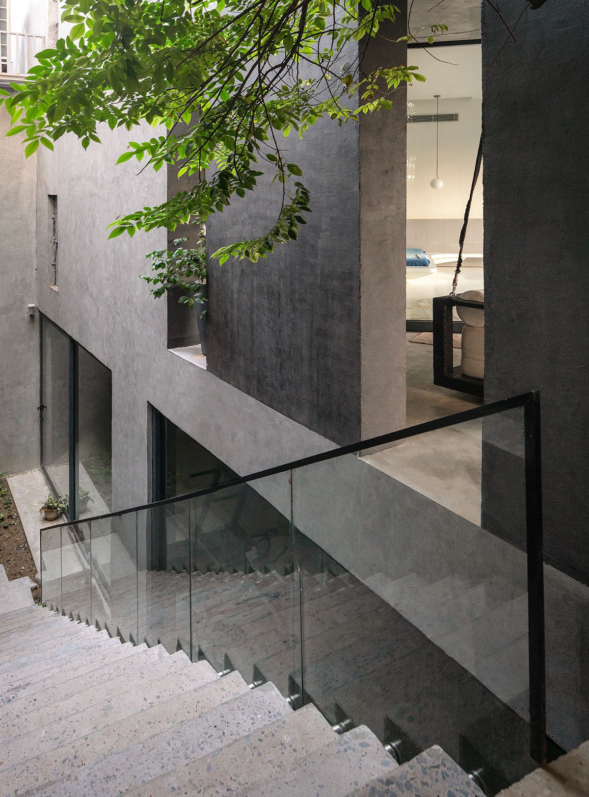 This outdoor terrace space created on the first floor acts as a balcony and at the same time as the direct entrance to the first-floor apartment. The landscape garden on the terrace enjoys the views of the neighborhood park with a feeling of being nested with nature. These three outdoor spaces have different usability based on the time of day and season of the year. Existing trees on site have been retained in the design and the shading from these trees has been used to create ambient outdoor spaces, which could be used in the extreme climatic conditions of Delhi NCR.
