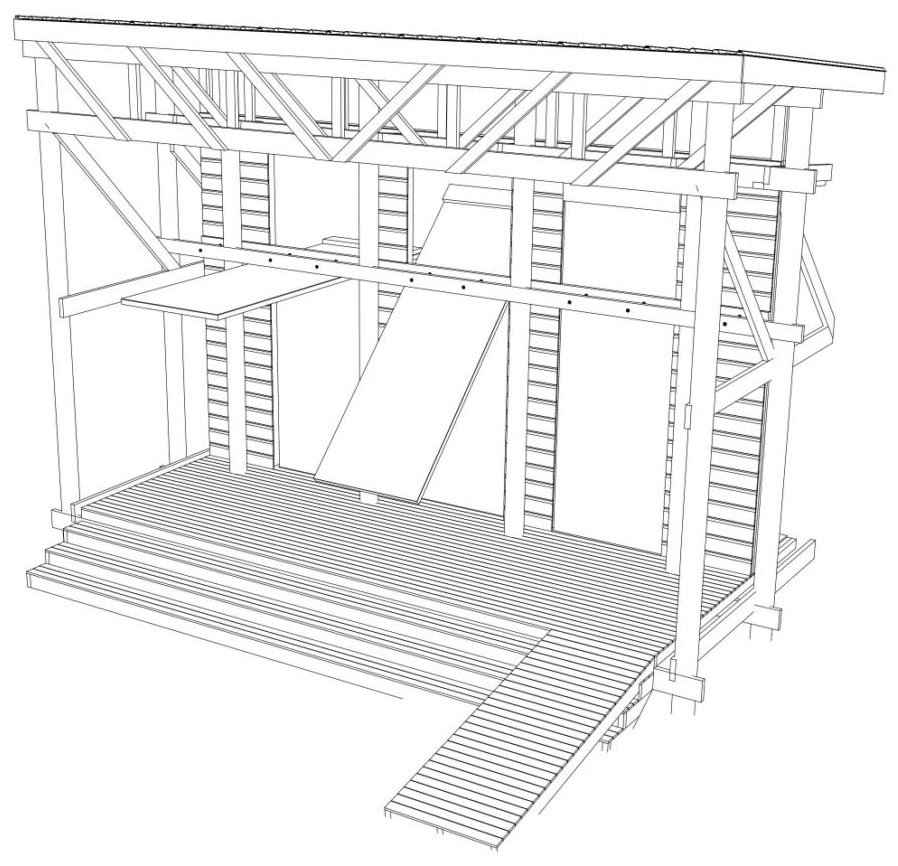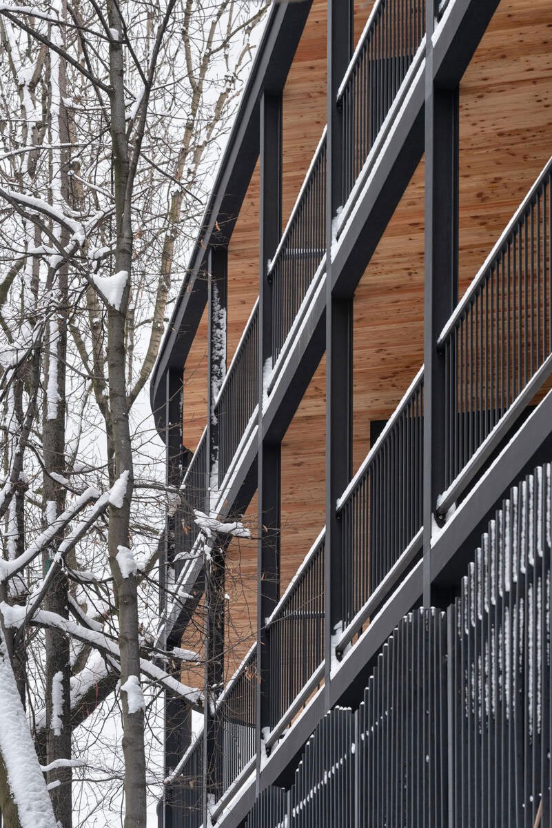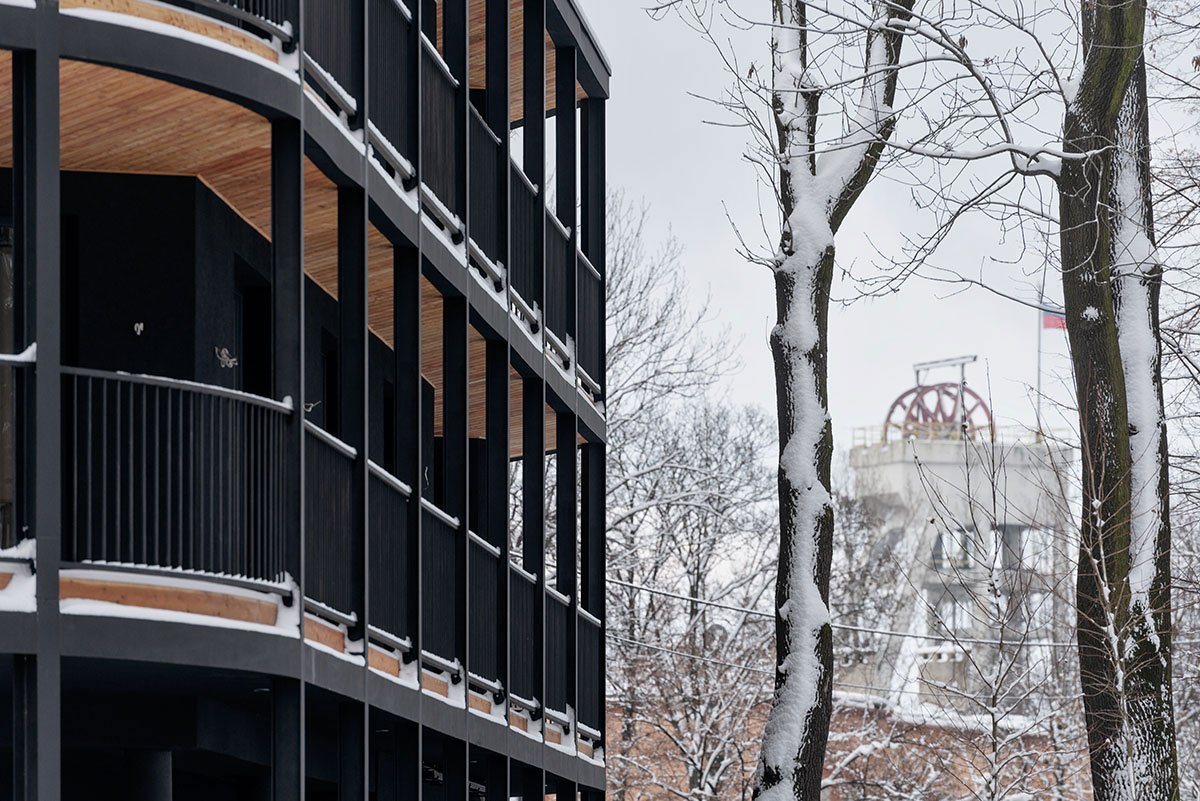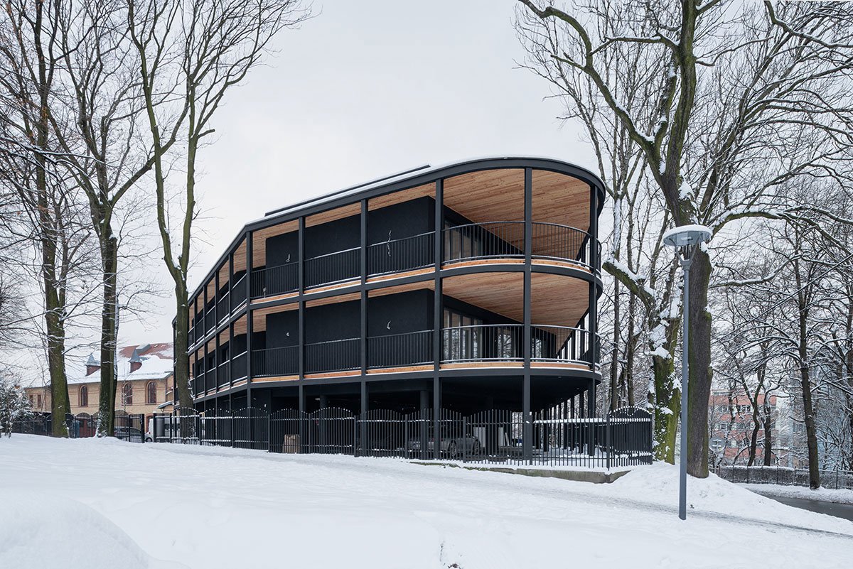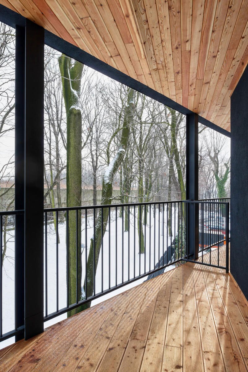 Creating the form step by step, first of all: the solid was formed in accordance with the function of the apartments, optimizing their function into the shape of an irregular polygon. Then, a perimeter line was marked along the plot boundaries and the block of flats was surrounded with balconies to obtain a panoramic opening to the surroundings. Due to the acute angles (foreign in the context), it was decided to round the corners, referring to the character of the interwar villas in the neighborhood, tree crowns and the surrounding greenery. In the next step, to open the view to the surroundings, the block was dressed in wooden viewing terraces with various surfaces around it, an internal break in the form was introduced by implementing a patio to illuminate the internal parts of the apartments (bathrooms and entrance areas to the apartments) and the floor of the residential part was raised by one level, leaving undeveloped ground floor as a space for social interactions of residents and additional external functions.