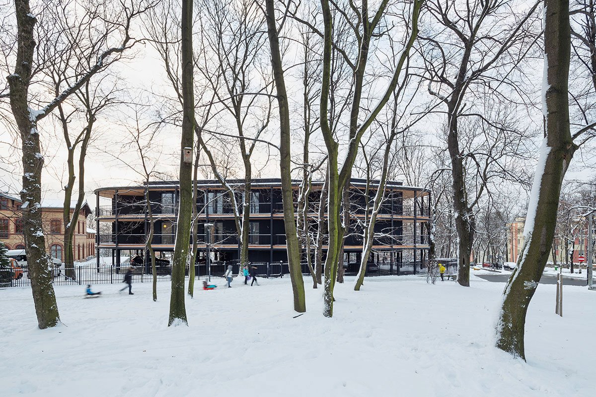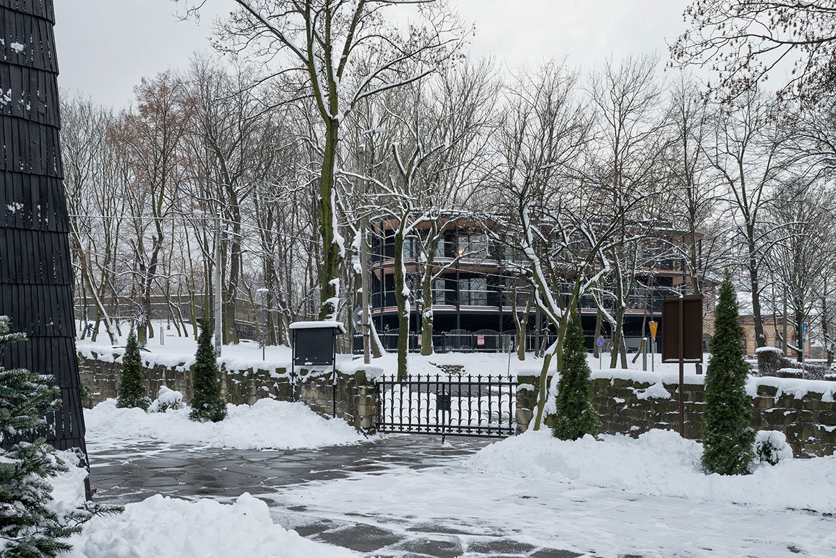 [Text as submitted by architect] The unique context of the place and the potential negative consequence of implementing a new tissue in this unique area meant that the decision to shape a new building was not easy and had to refer directly to these guidelines, not compete with them, and “respond” to the environment with its uniqueness in a contemporary way. The task was even more difficult as the budget was limited and the investor’s expectations were high. The idea and shape of the building resulted directly from the irregular polygonal shape of the area intended for development and the idea of leaving the largest possible tree stand on the plot. Such a simple inspiration has become the basic guideline for shaping the building.