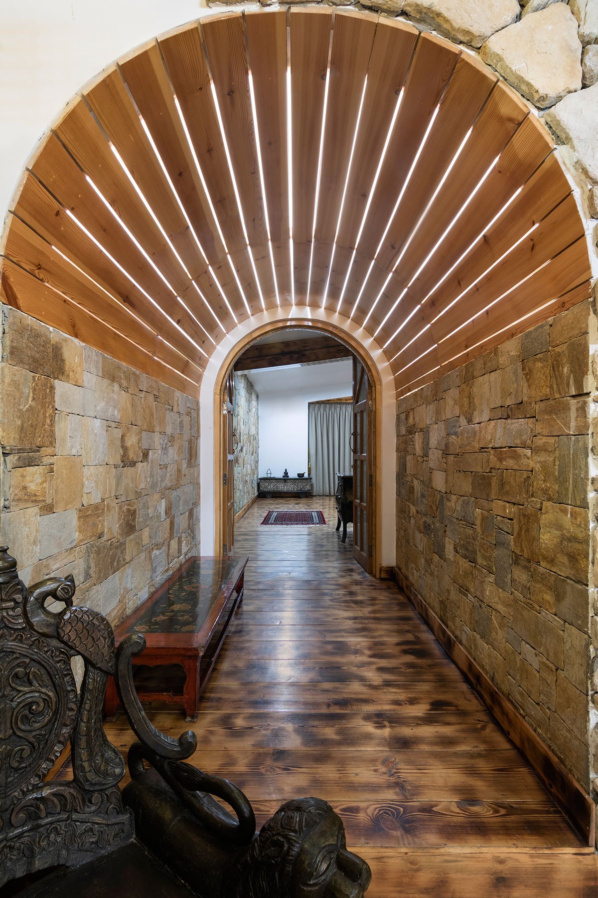 Rustic yet sophisticated texture palettes take centre stage in this residence, reflecting Anu and Rahul’s requirements of a non-urban dwelling. The villa is asymmetrical and modern, while its interiors dovetail traditional Indian design. The deliberate dominance of local material imparts a sense of authenticity and rootedness to the design. The facade is built using an elegant randomised combination of stone and brick with two round glass windows capturing the southern light.
