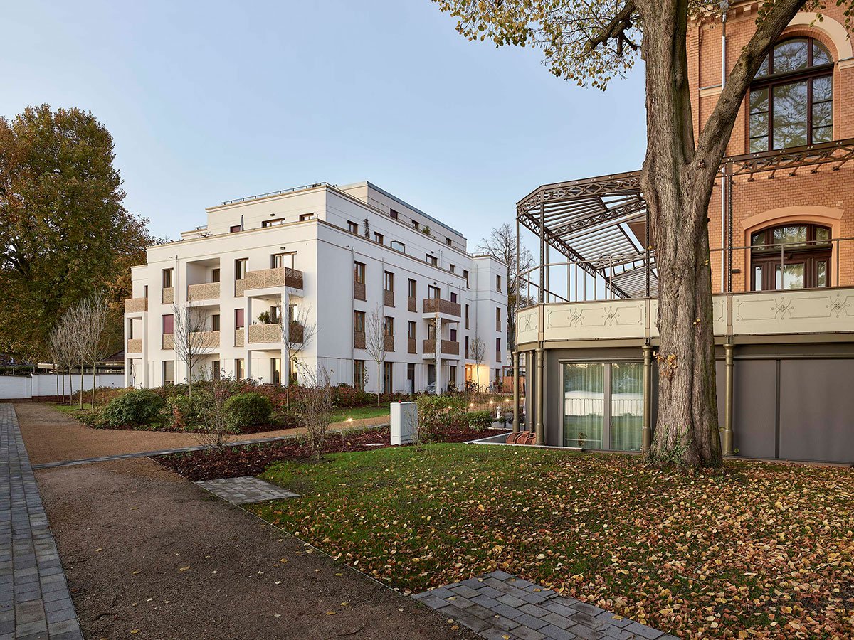 To the south of the historic, renovated and repurposed Gesellschaftshaus, another new building was constructed, which incorporates the storeys and some design elements of the U-shaped neighboring building. Here, however, the cornices are more flat and a monochrome white colour scheme was chosen for the rendered façades with colourful accents in the form of textile sun protection and the lock elements. This area is used exclusively for residential purposes.