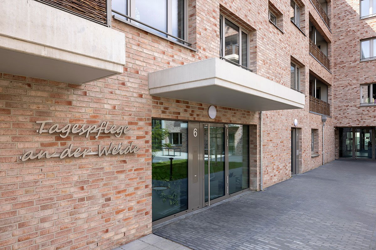 Regular perforated façades, developed from the floor plans of the living spaces, are clad with clinker brickwork in warm sandy colours and shades of red. Arcades, deep loggias, and generous ground-floor glazing provide a special lightness. Alternating between clinker and glazed surfaces makes the uses clearly legible and ensures good orientation in the quarter. The structure and materiality of the Willow Church were taken up in the design of the loggia railings: the steel railings of all open balustrades were given a horizontal filling of wickerwork, which was made traditionally by hand.
