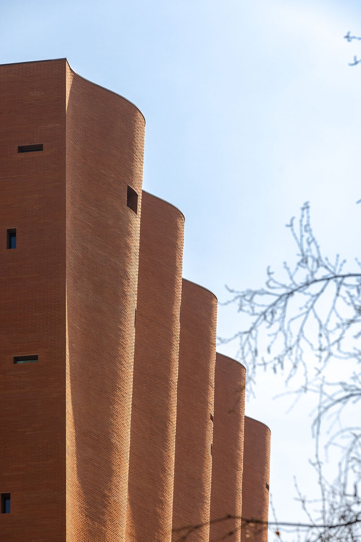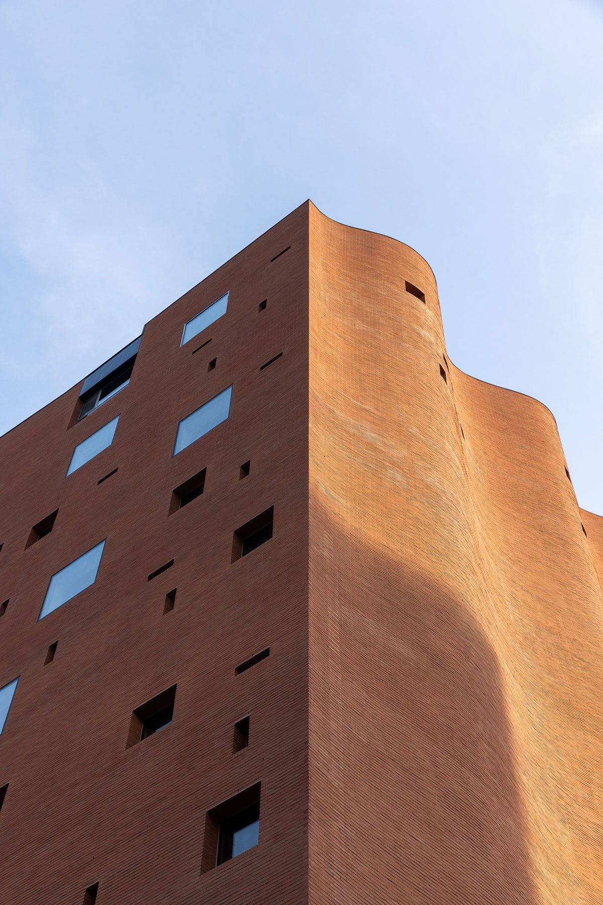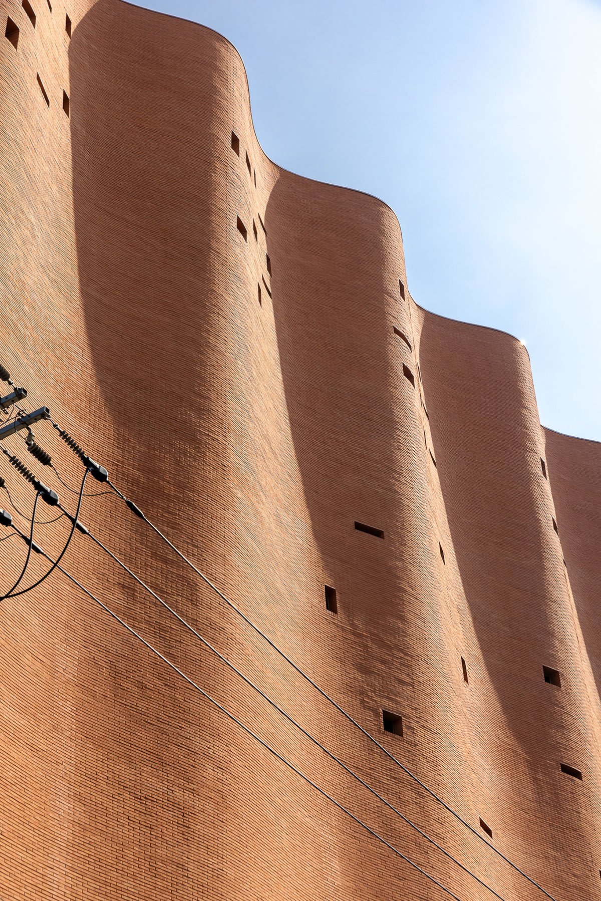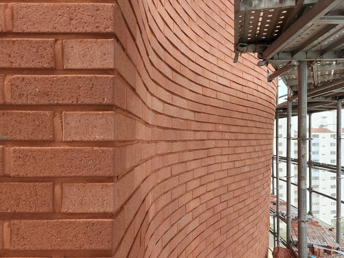 The adopted solution in this case is a literal ‘curtain wall’ system using bricks, attached to a concrete wall cast “in situ” that serves as a guide to construct the curve. With the help of a digital computational tool, the architects could devise a rather simple algorithm for creating the intended wave effect rising up to the sky. With 520 courses of brick height, every 24 courses a new brick is added to achieve the desired curve growth. The wave amplitude ranges from 0 on the third floor where it starts, to 170cm at the roof line.