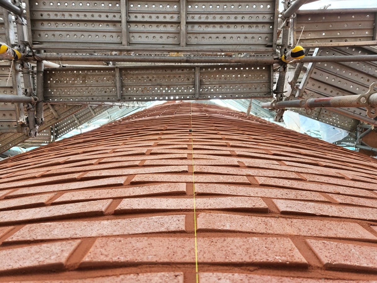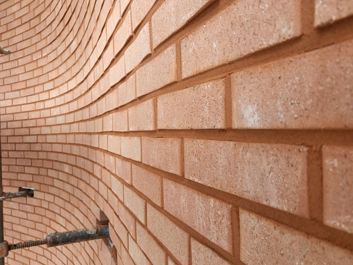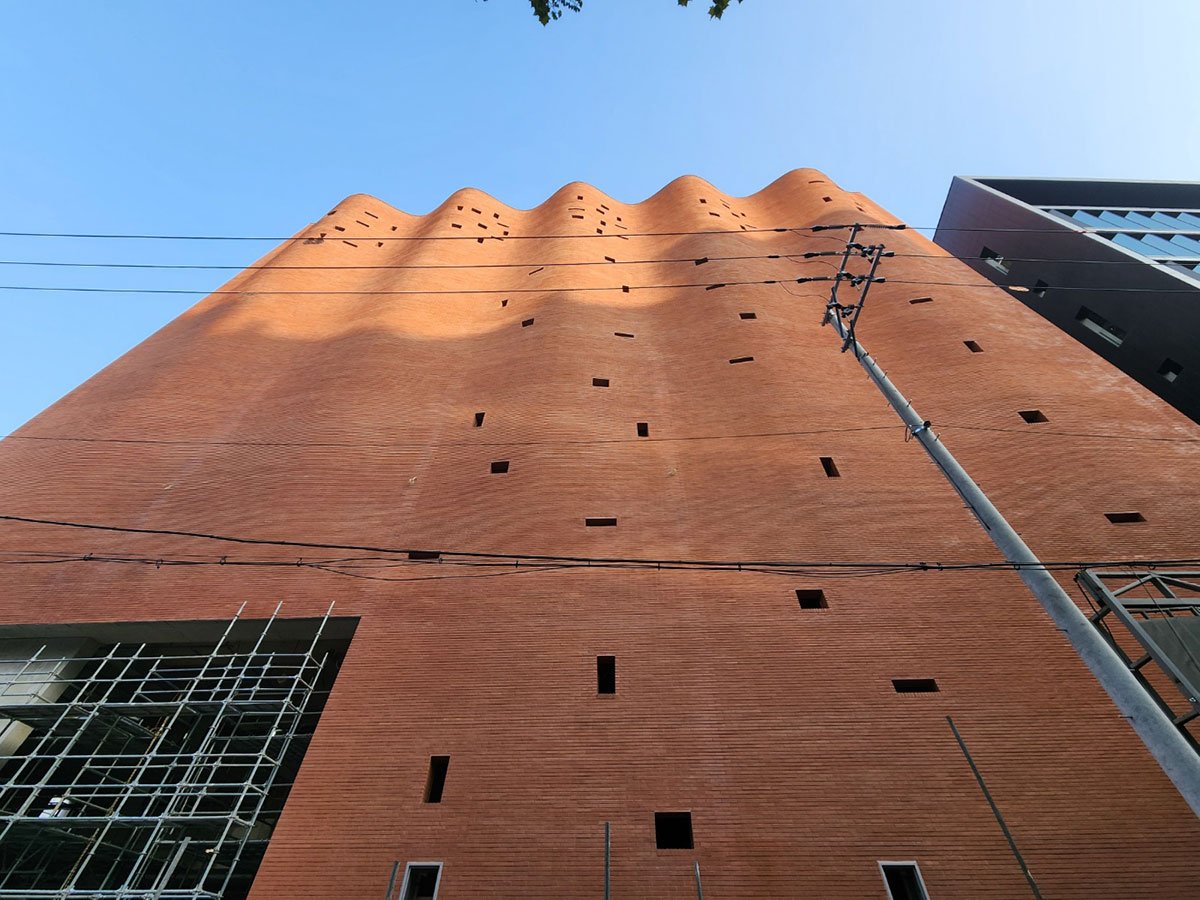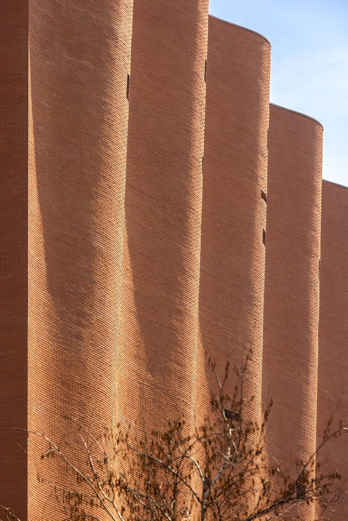 The adopted solution in this case is a literal ‘curtain wall’ system using bricks, attached to a concrete wall cast “in situ” that serves as a guide to construct the curve. With the help of a digital computational tool, the architects could devise a rather simple algorithm for creating the intended wave effect rising up to the sky. With 520 courses of brick height, every 24 courses a new brick is added to achieve the desired curve growth. The wave amplitude ranges from 0 on the third floor where it starts, to 170cm at the roof line.