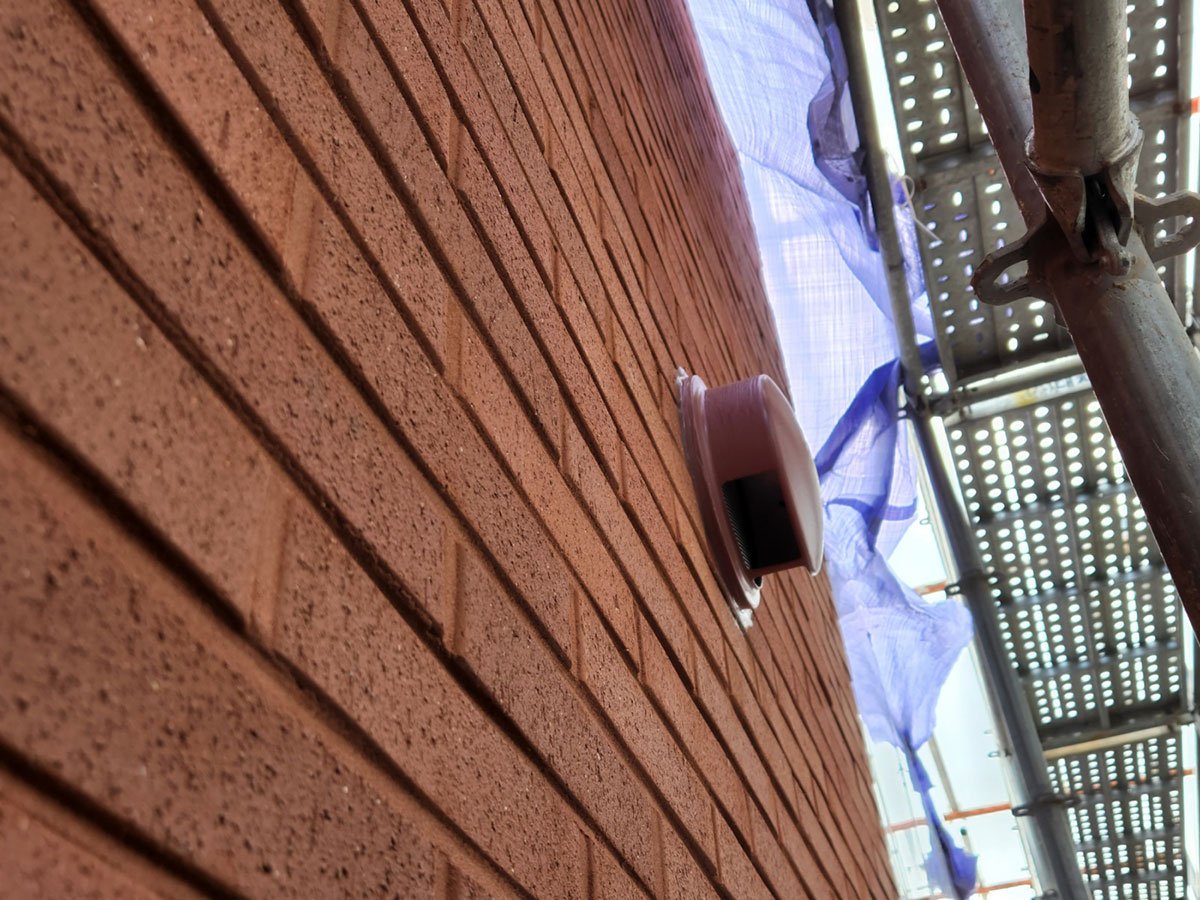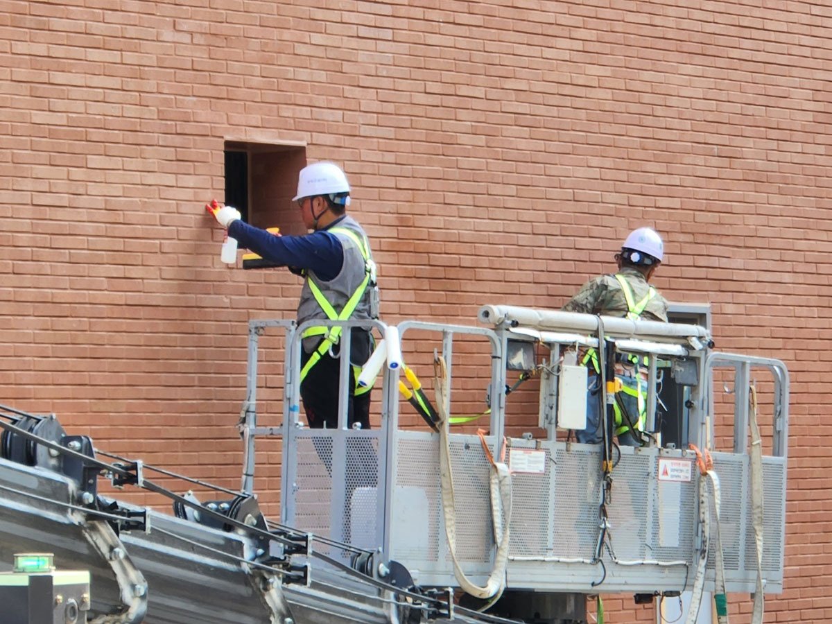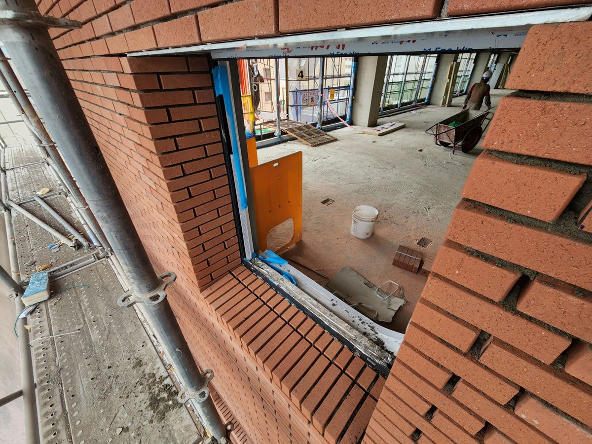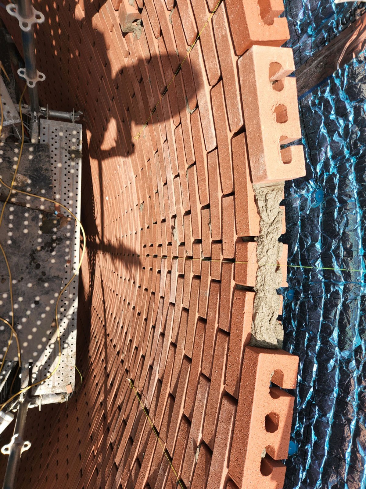 The adopted solution in this case is a literal ‘curtain wall’ system using bricks, attached to a concrete wall cast “in situ” that serves as a guide to construct the curve. With the help of a digital computational tool, the architects could devise a rather simple algorithm for creating the intended wave effect rising up to the sky. With 520 courses of brick height, every 24 courses a new brick is added to achieve the desired curve growth. The wave amplitude ranges from 0 on the third floor where it starts, to 170cm at the roof line.