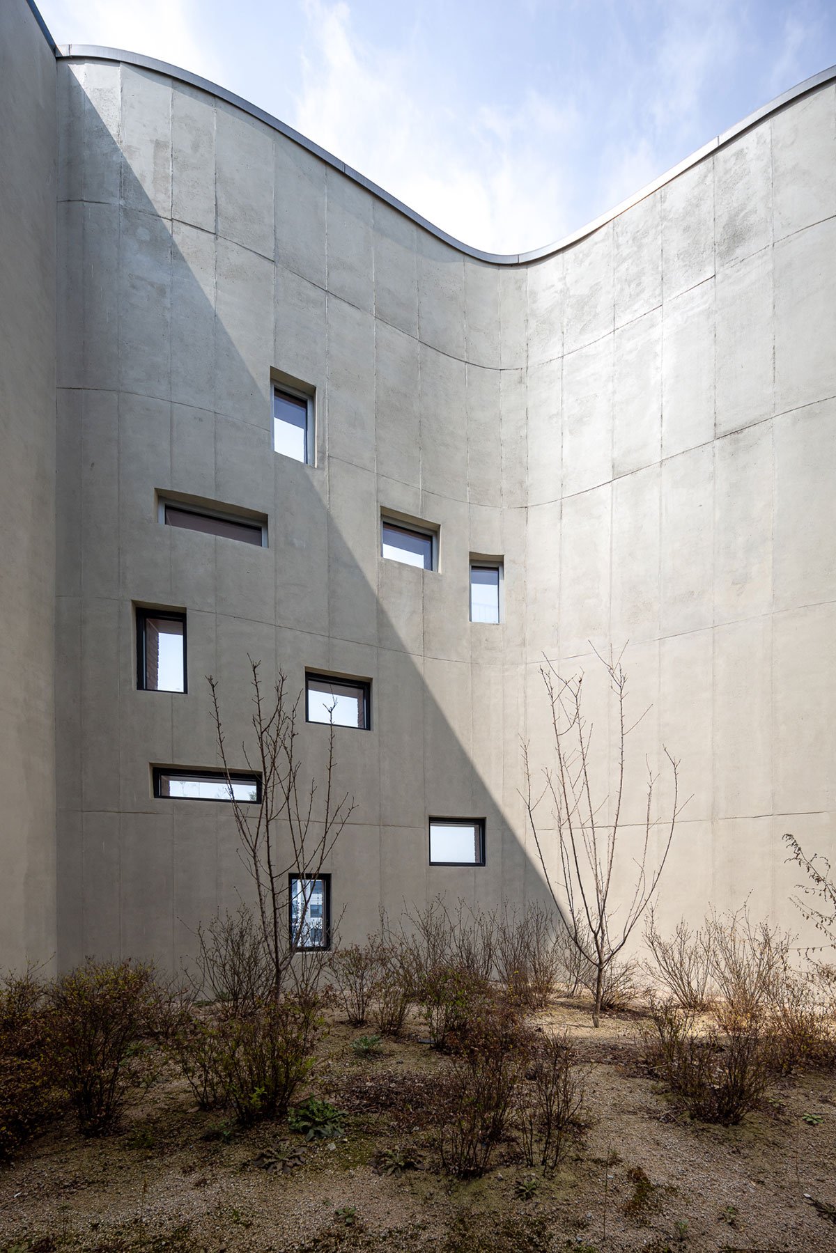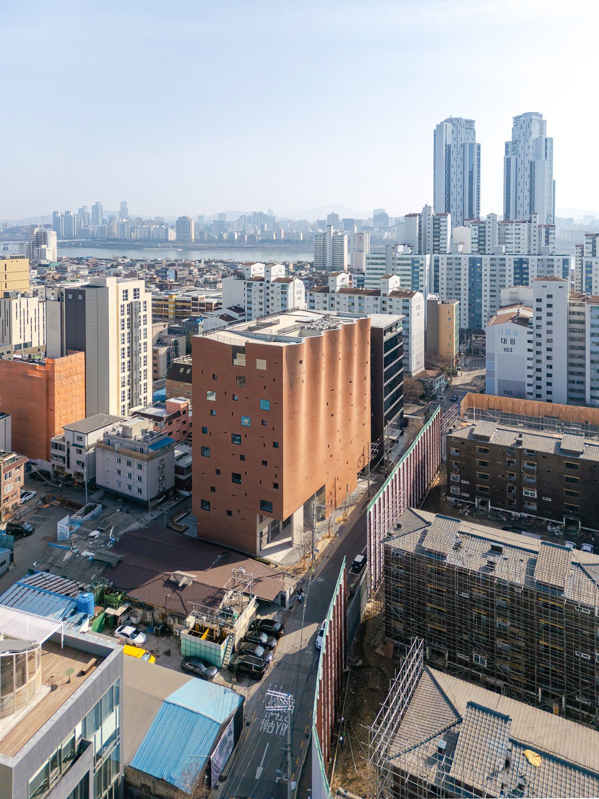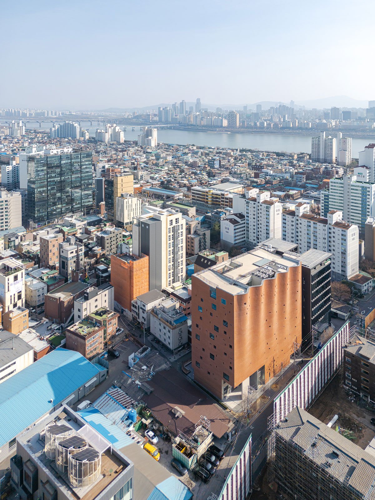 The waving façade acts as a backcloth for the urban perspectives of the streets that lead into Seongsu-dong District from the west across the Seoul Forest Park. This characteristic solid façade houses the service program and the vertical circulations, while the outdoor gardens and terraces on the east façade offer a wide open view towards the Han River and Seongsu-dong District. The north façade is composed by apparently random openings categorized by three different types that respond to programmatic requirements of the space.