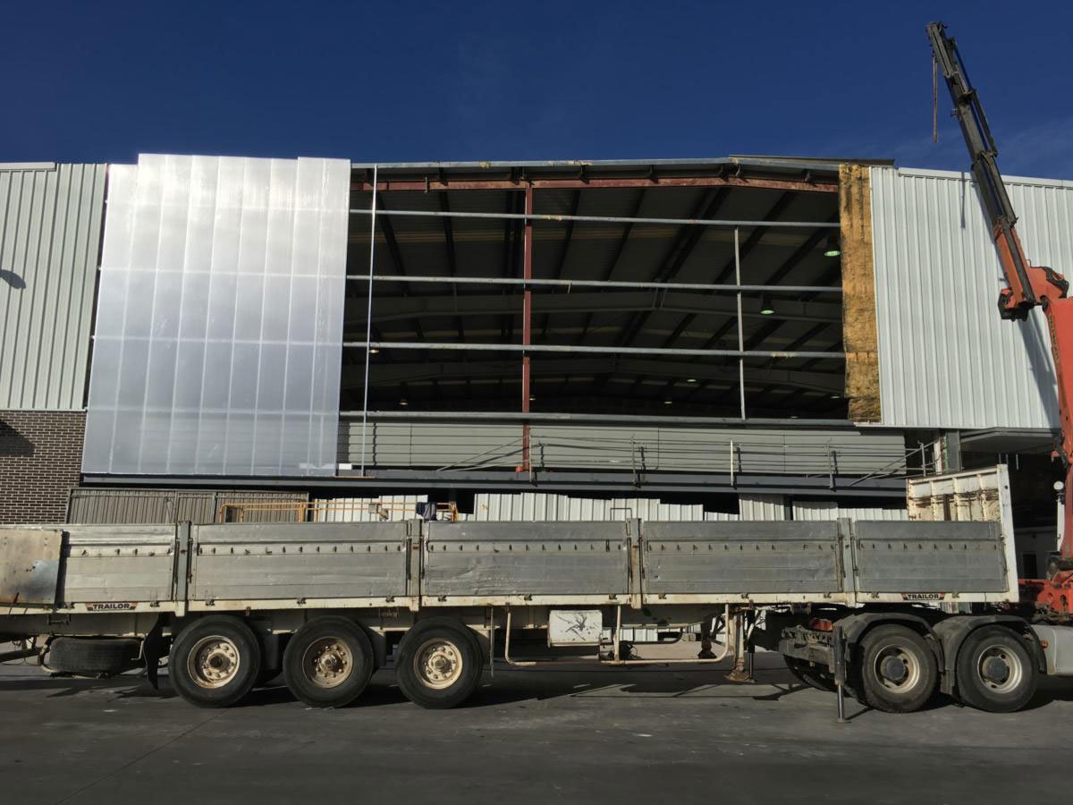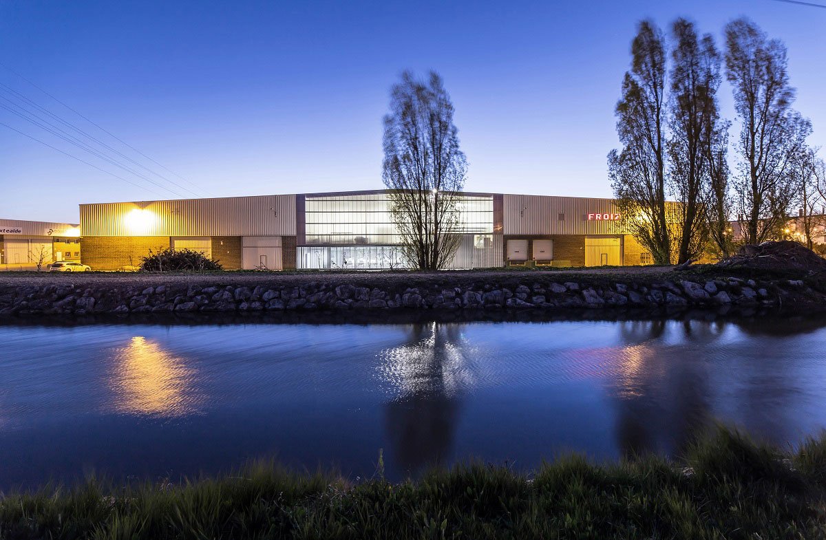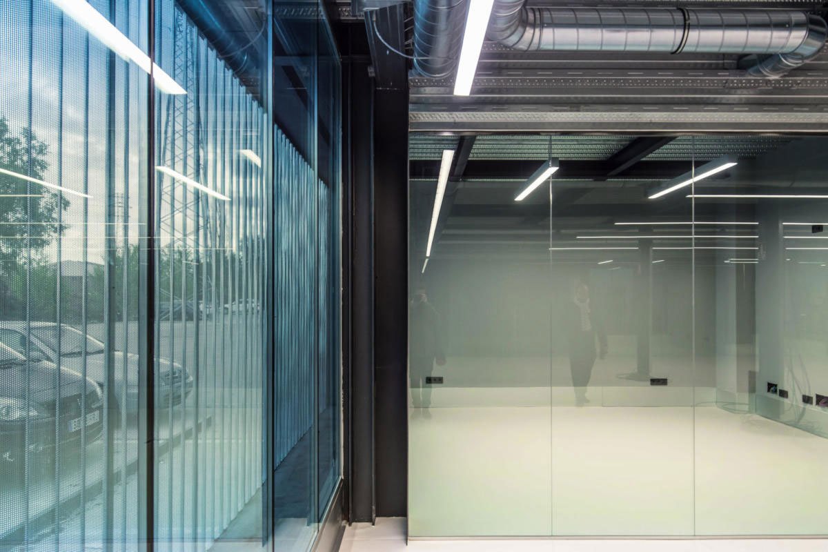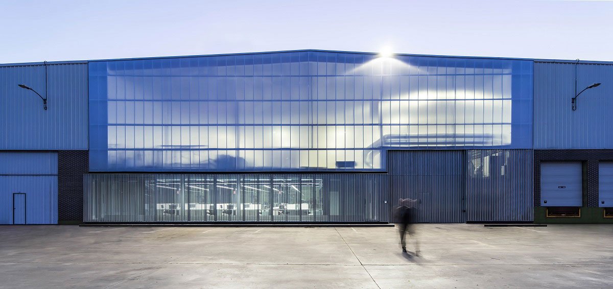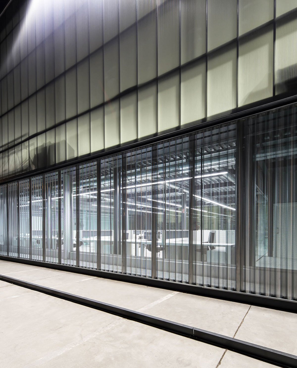 The old facade presented serious problems of stability. Consequently was replaced by new porous and translucent facade skins. The traditional industrial facade of sandwich panel and brick walls is replaced by various overlapped layers of glass, polycarbonate and perforated steel sheet, which allows daylight to filter through to the interior spaces of the warehouse and offices. The intentional creation of this new industrial atmosphere, based on natural light, improves the energy performance and the well-being of workers who are not subjected to cold and artificial clarity.
