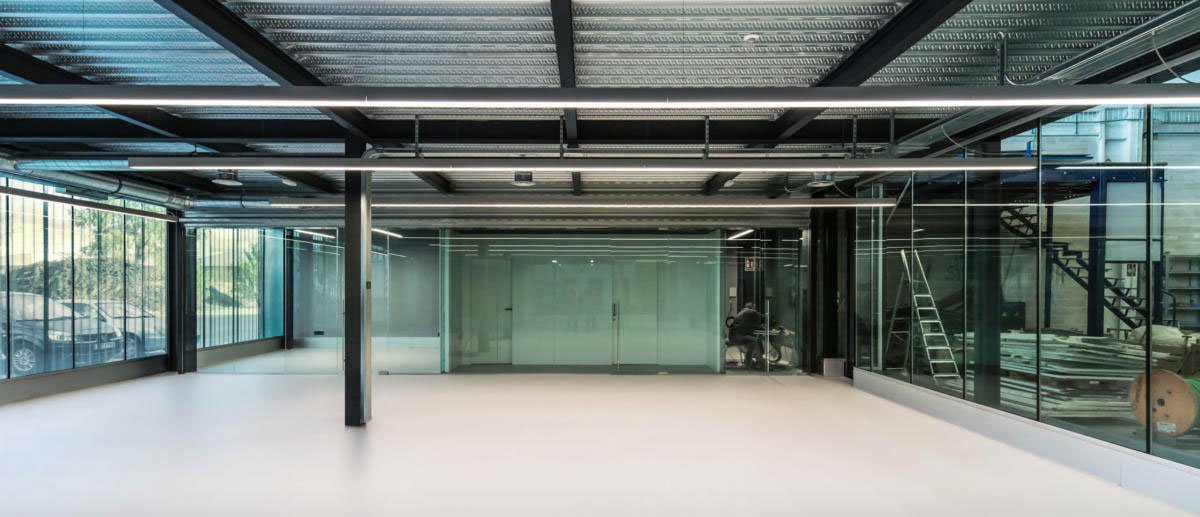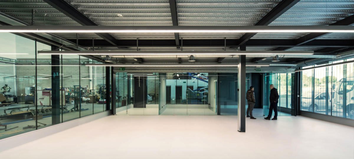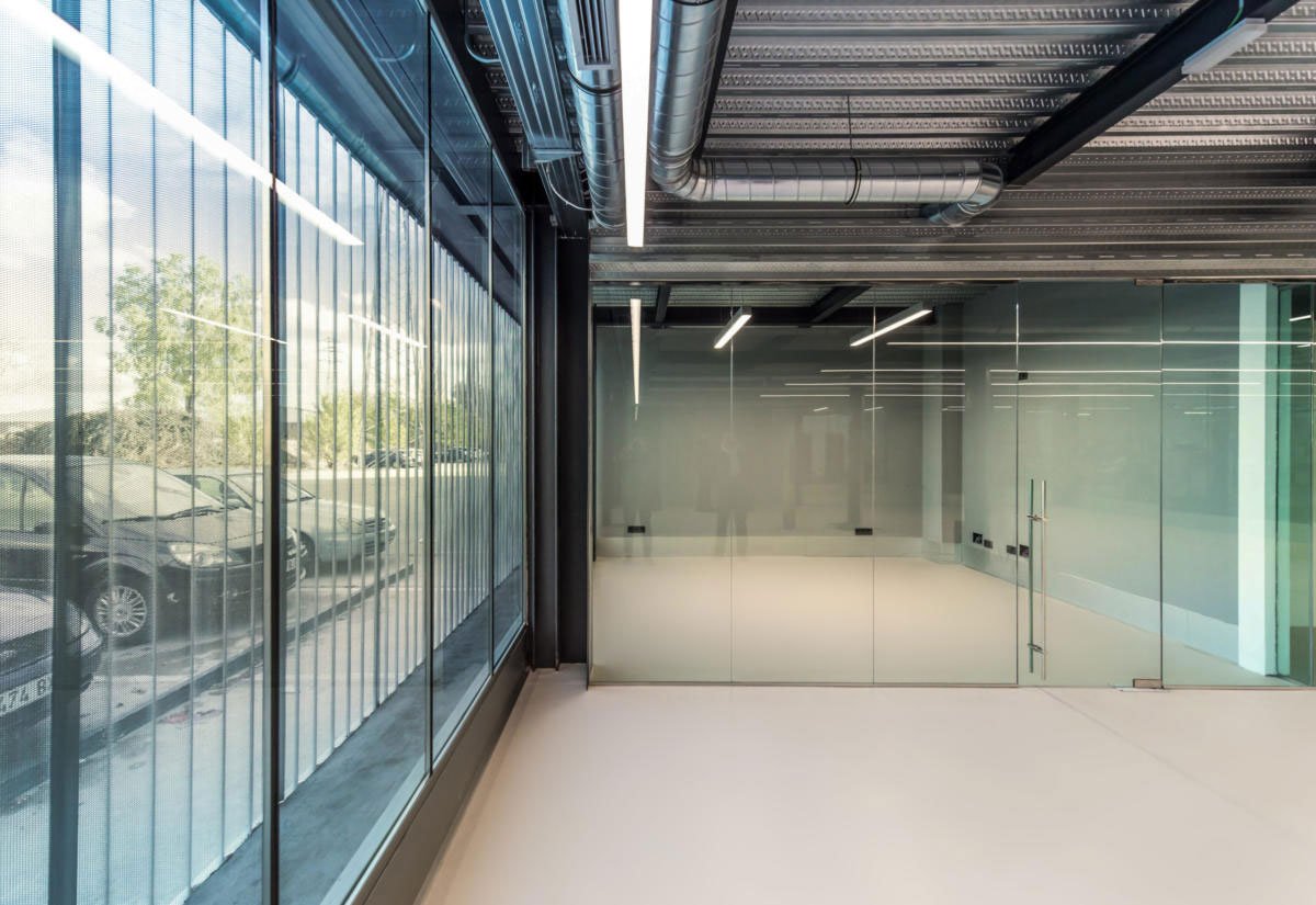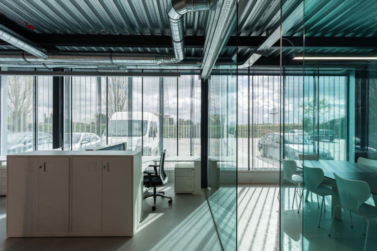 In the offices, the structure and materials are sincerely shown, replacing all opaque preexisting perimeters by glass. Structure, the mixed concrete decking slab and installations are left raw, visible and exposed. The wide glass walls allow the visual contact between the warehouse working area and the technical office; this relation is essential for a correct execution and allows the inclusion of light not only from the street but also from the interior of the warehouse.