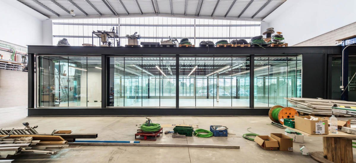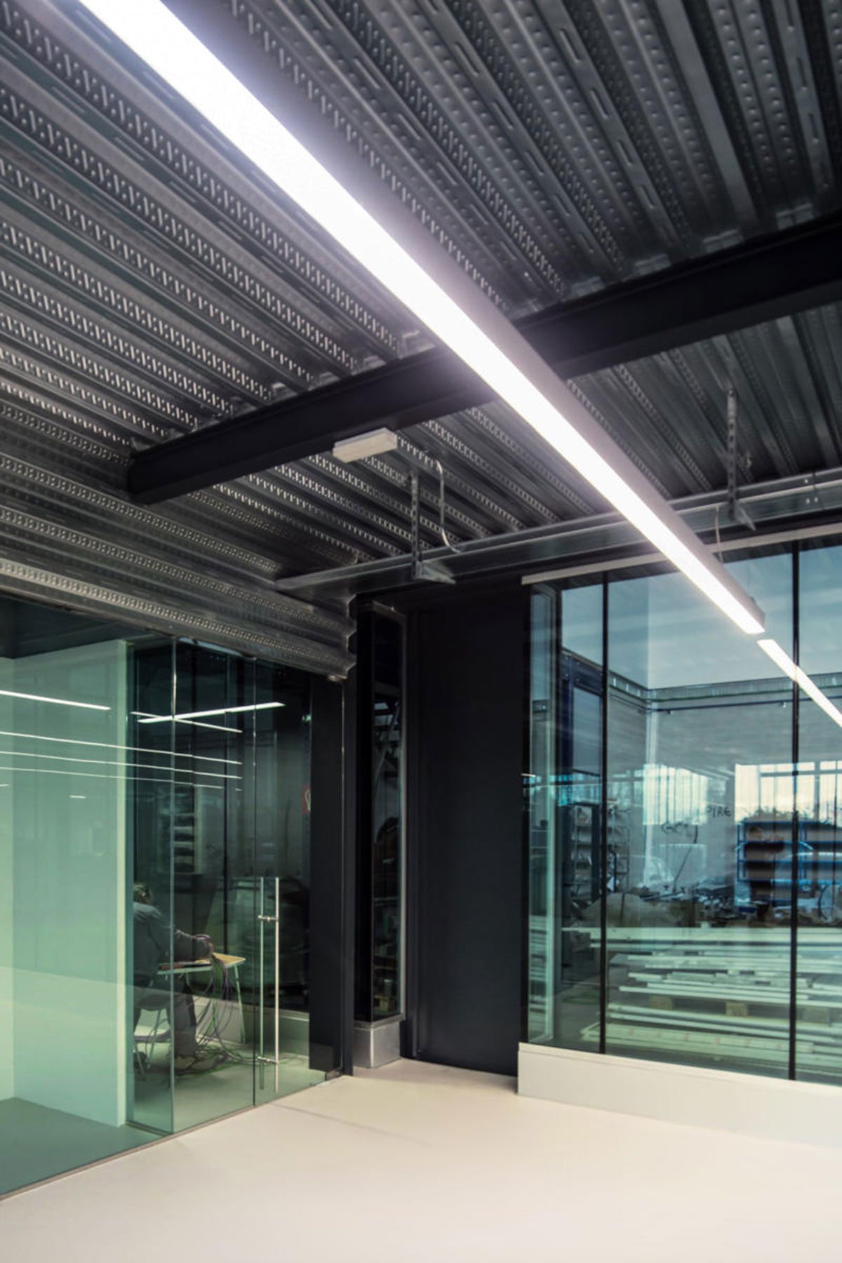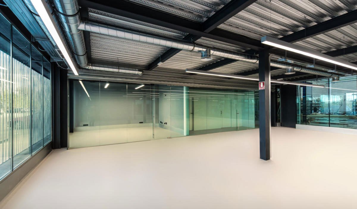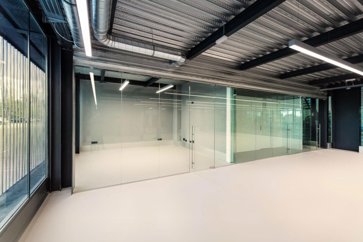 In the offices, the structure and materials are sincerely shown, replacing all opaque preexisting perimeters by glass. Structure, the mixed concrete decking slab and installations are left raw, visible and exposed. The wide glass walls allow the visual contact between the warehouse working area and the technical office; this relation is essential for a correct execution and allows the inclusion of light not only from the street but also from the interior of the warehouse.