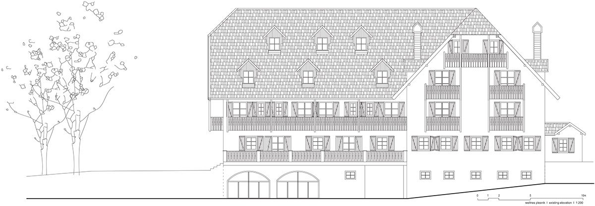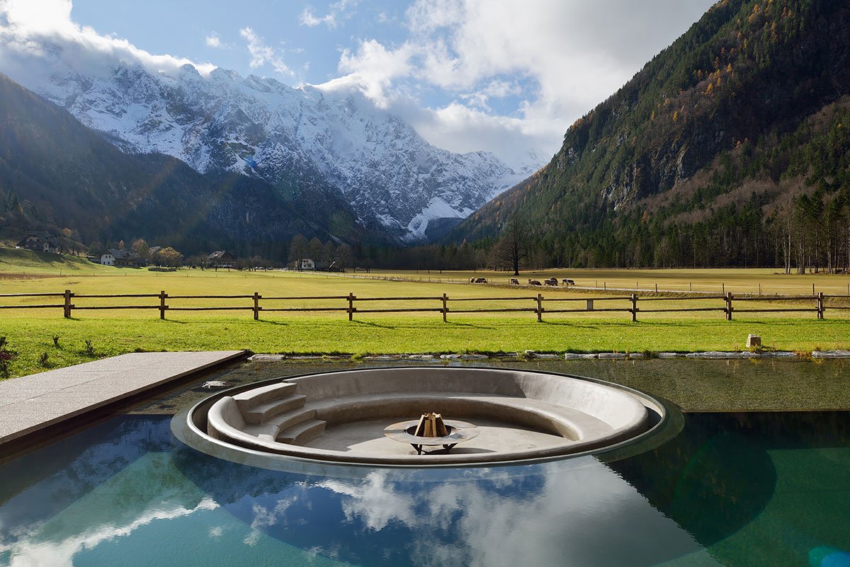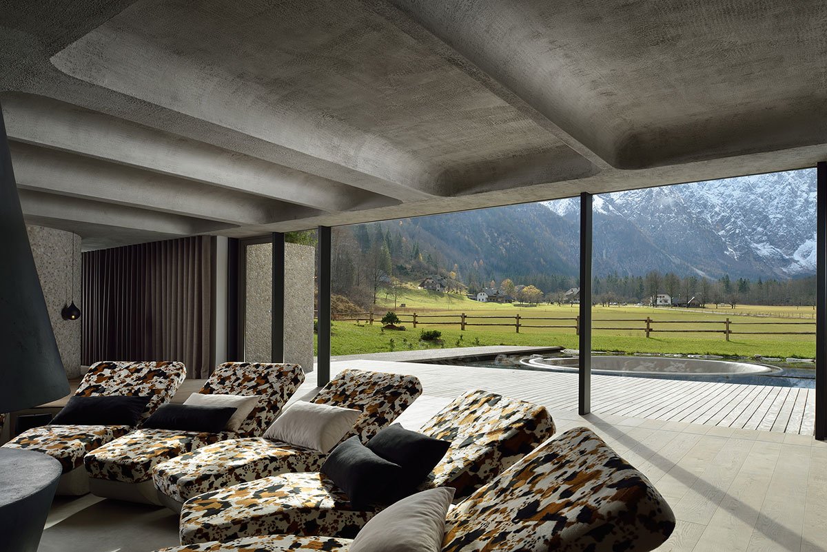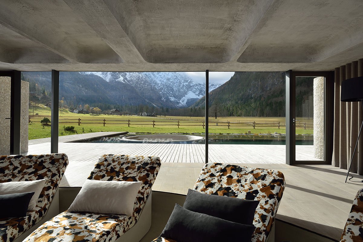 [Text as submitted by architect] Hotel Plesnik is a boutique family hotel found in the heart of a nature park, boasting a tradition spanning over eighty years. Its exceptional location at the end of a glacial valley offers an unforgettable view of the majestic peaks of the Kamnik-Savinja Alps. As Logarska Valley is claimed by many to be one of the most beautiful valleys in Europe, the amazing view of this natural wonder was the obvious choice for one of the leading motifs in the renovation of the hotel’s wellness centre.
