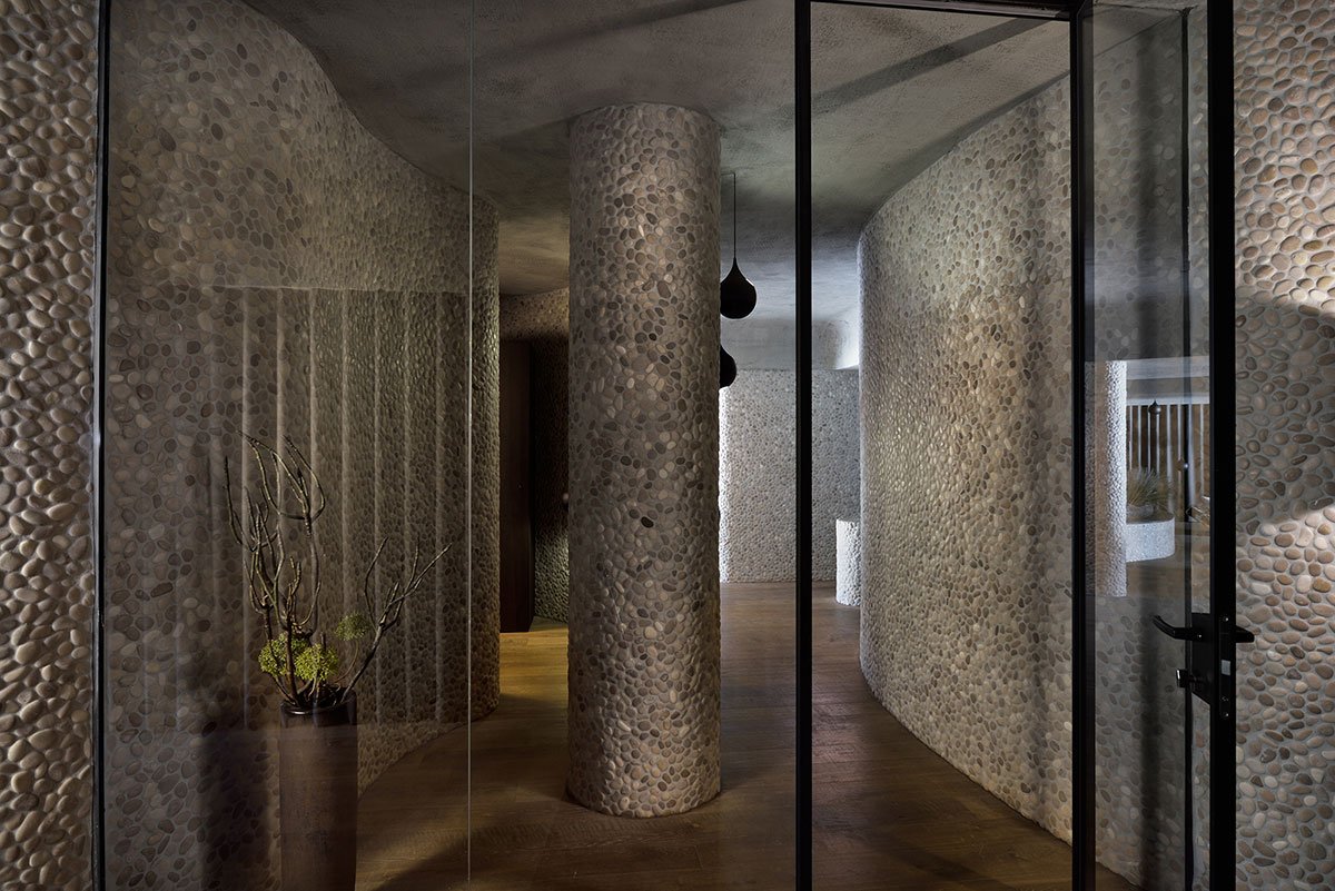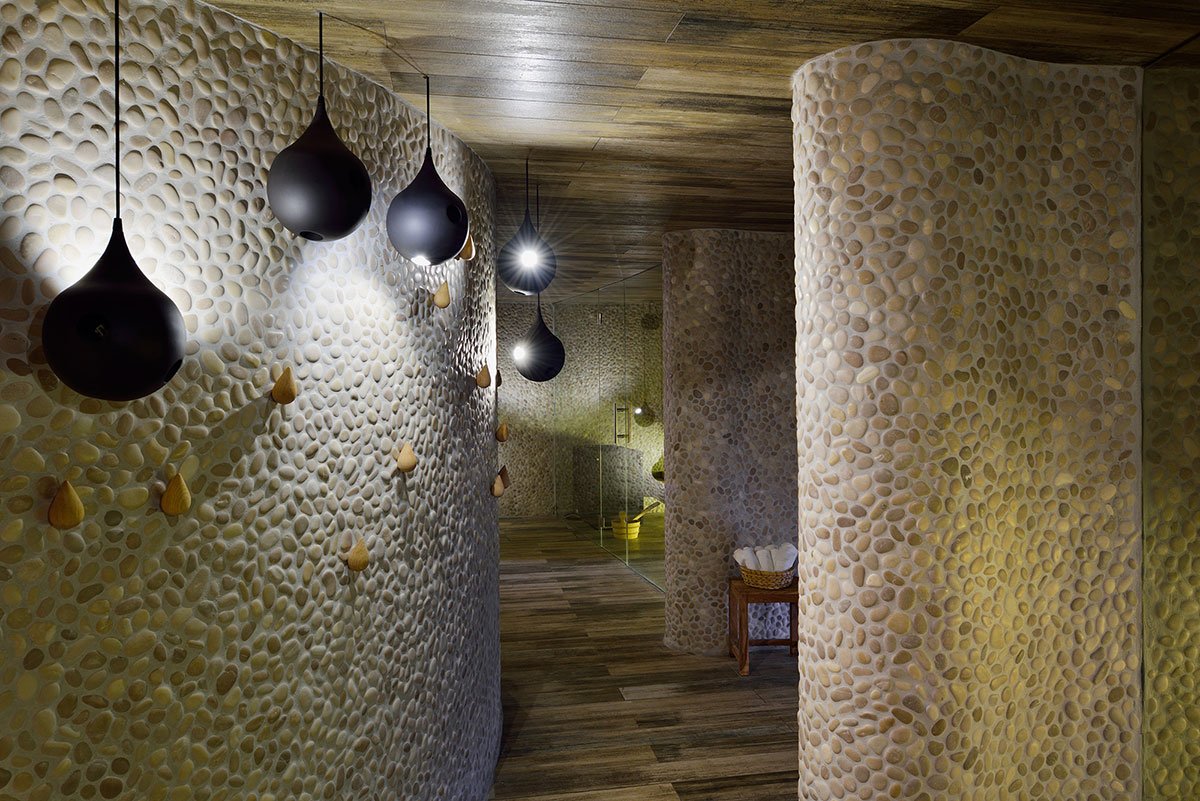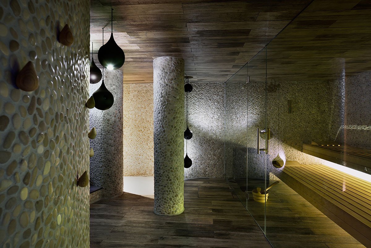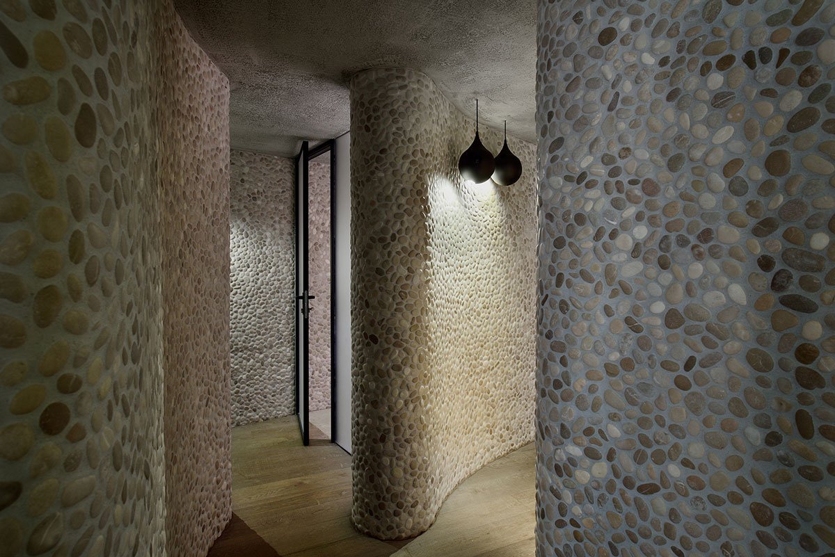 The entire ambience of Wellness Plesnik is designed using local materials exclusively. The undulating interior walls were necessitated by the markedly awkward and heterogenous construction design of the existing space. A relaxed placement of interior divides envelopes and conceals all the irregularities and forms a fluid space terminating in the valley itself. The pebble-laid walls of the space physically transition also into the exterior and optically divide the sun deck into three parts: the sauna section, the section with the central wellness space, and the entrance portal.