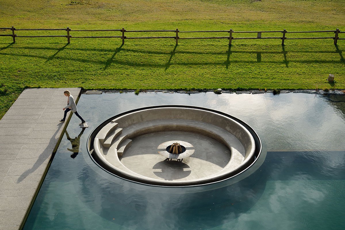Despite natural filtration by means of aquatic plants, the new pool is unequivocally rectilinear in shape and as such designed to be a continuation of the building rather than the surrounding landscape. Referencing the interior resting area with the fireplace, a relaxation area with a fire ring has been placed in the middle of the water surface outside. Using the space, the visitors of the new wellness centre witness a never-ending dialogue between water and fire, two basic natural elements accentuating the incredible backdrop of the surrounding hill range.