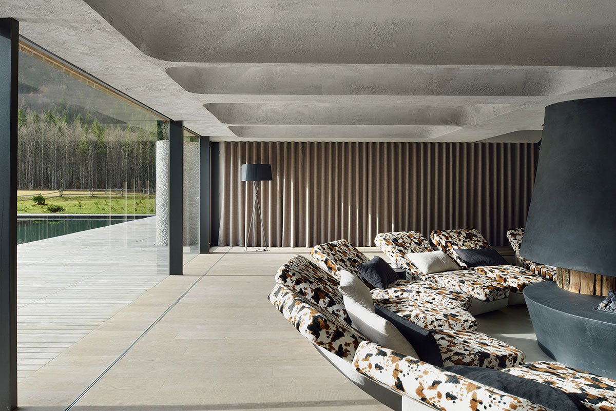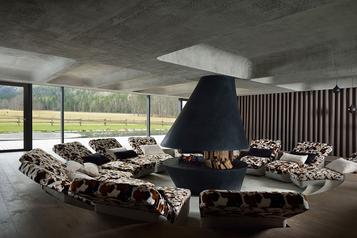Much of the space of the pre-existing wellness centre in the partially cut-in basement of the building was originally taken up by a small, organically shaped pool which opened onto a tanning deck directly in front of the building. To recover the space needed for new programmes, the pool was in part replaced by a large whirlpool, while a section of the former pool shell closer to the view of the valley was repurposed as a sunken circular resting area featuring a fireplace. The sun deck has been extended with a natural swimming pool, which makes up for and expands on the deleted interior water surface, while the reflection in the water further accents the beautiful view.
