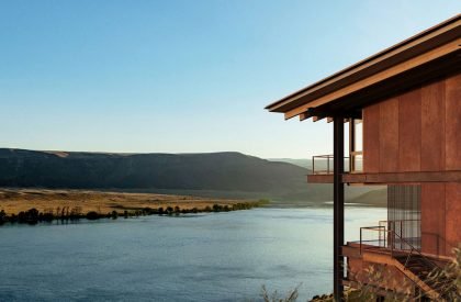 The dramatic landscape at West Bar was formed by vast lava flows which were covered by glaciers during the last ice age before being carved and scoured by floods which swept the area to create the Columbia River. In order to preserve the unique terrain and geological history of the site, the architecture was intentionally stilted off the ground, drastically minimizing the area of excavation on the landscape.
