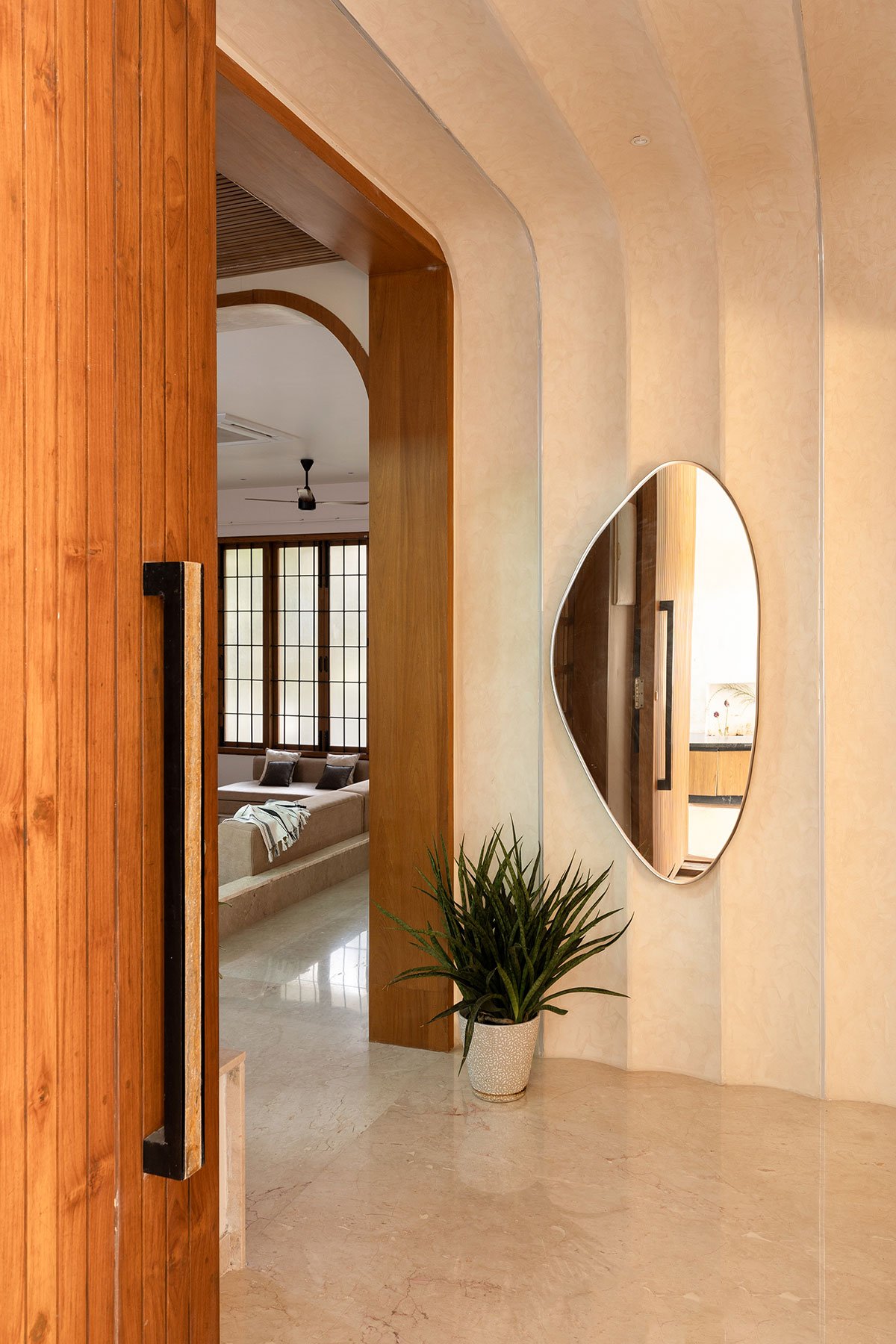 [Text as submitted by architect] Drawing inspiration from the serene landscapes and open-air living, this residence in the heart of Chennai is designed to be a tranquil retreat that seamlessly blends nature with modern comforts. The key concept was to craft a home that fosters relaxation and a deep connection with the outdoors while maintaining a sophisticated aesthetic. The use of rich wooden tones, rattan cane furniture, rustic stone cladding, and lush greenery helps achieve a warm and rejuvenating ambiance.