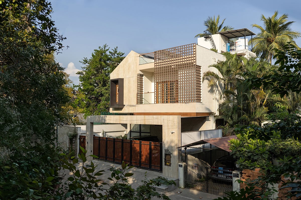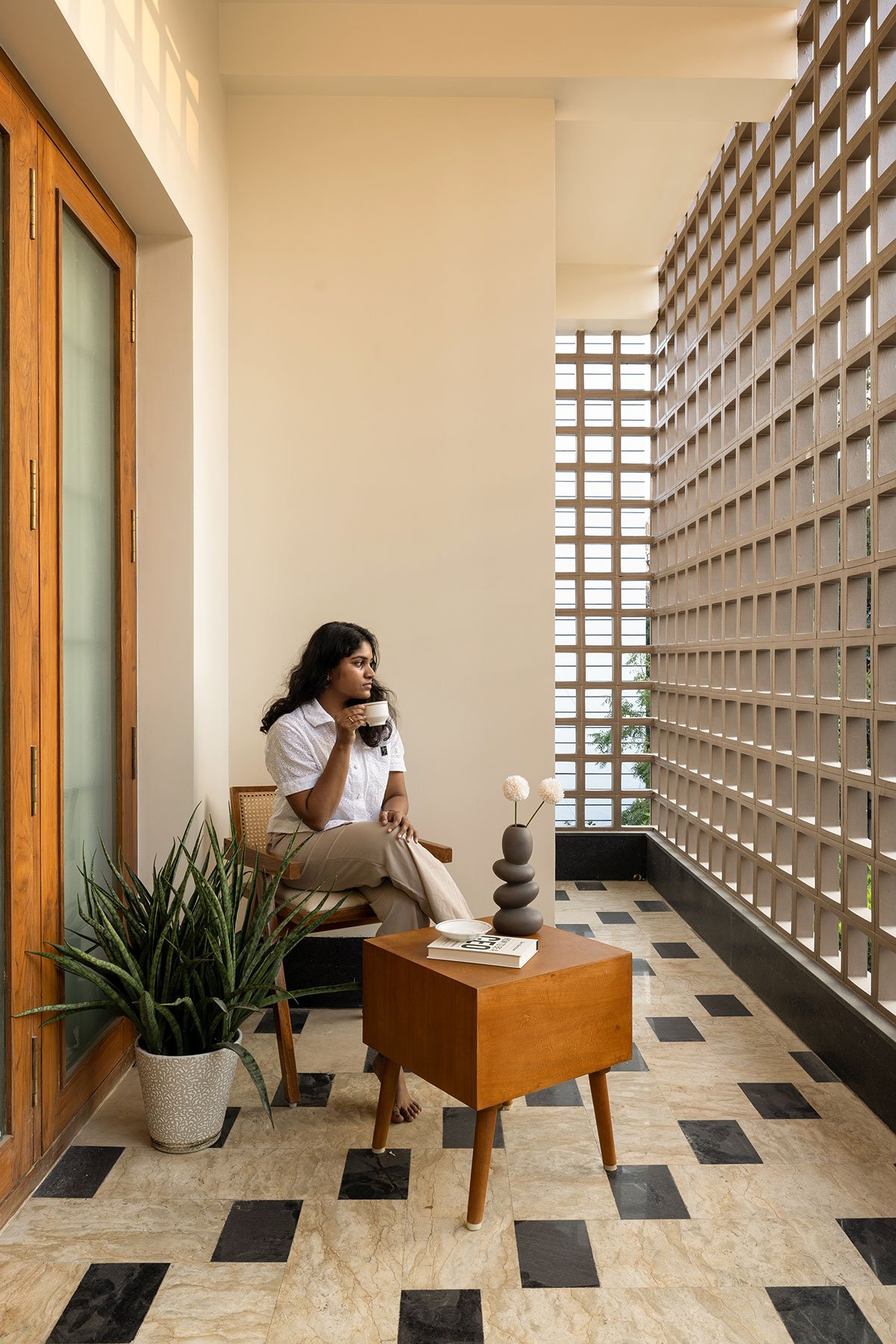 Seamlessly blending the indoors with the outdoors, the dining area extends into a charming sit-out framed by jaali walls, creating a perfect space for relaxation. The master bedroom, with its west-facing balcony and square jaali cladding, filters sunlight beautifully, casting intricate shadow patterns throughout the day. Meanwhile, the staircase, finished in copper travertine, connects the spaces elegantly while maintaining material continuity.