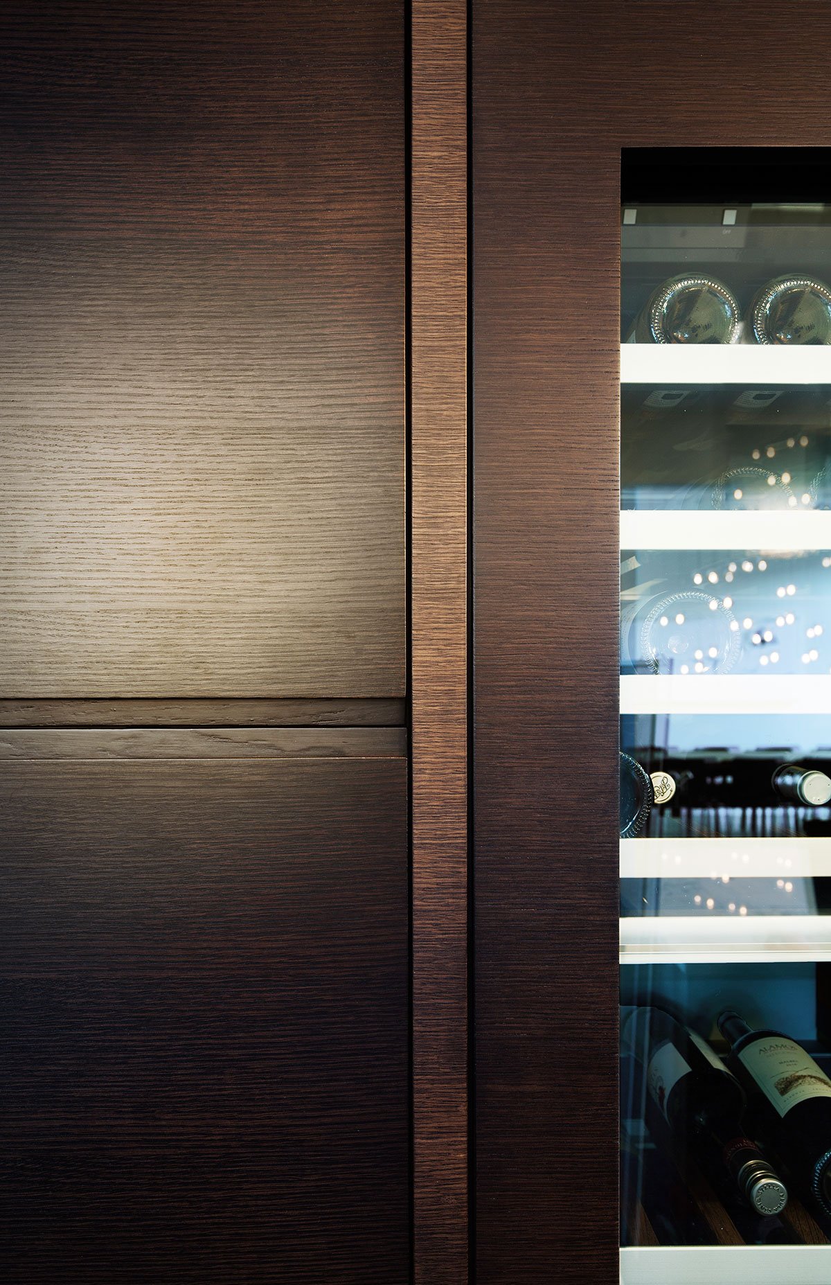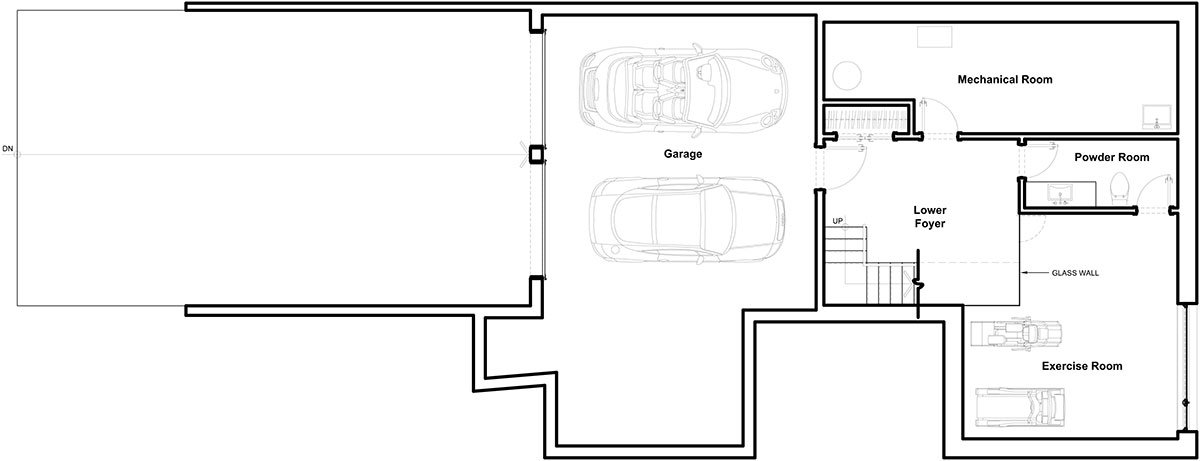 Upon stepping into the foyer, one is immediately presented with a series of linked views that unite the very front of the home to the very back of the property. The opposing wall of the interior foyer is entirely glass and shows the exterior, raised garden courtyard; this view continues through the courtyard and joins the interior of the formal dining room; this view then extends to an exterior garden bridge over the lower rear yard that ultimately joins visually to the interior of a three-season reading pavilion set in the rear yard.