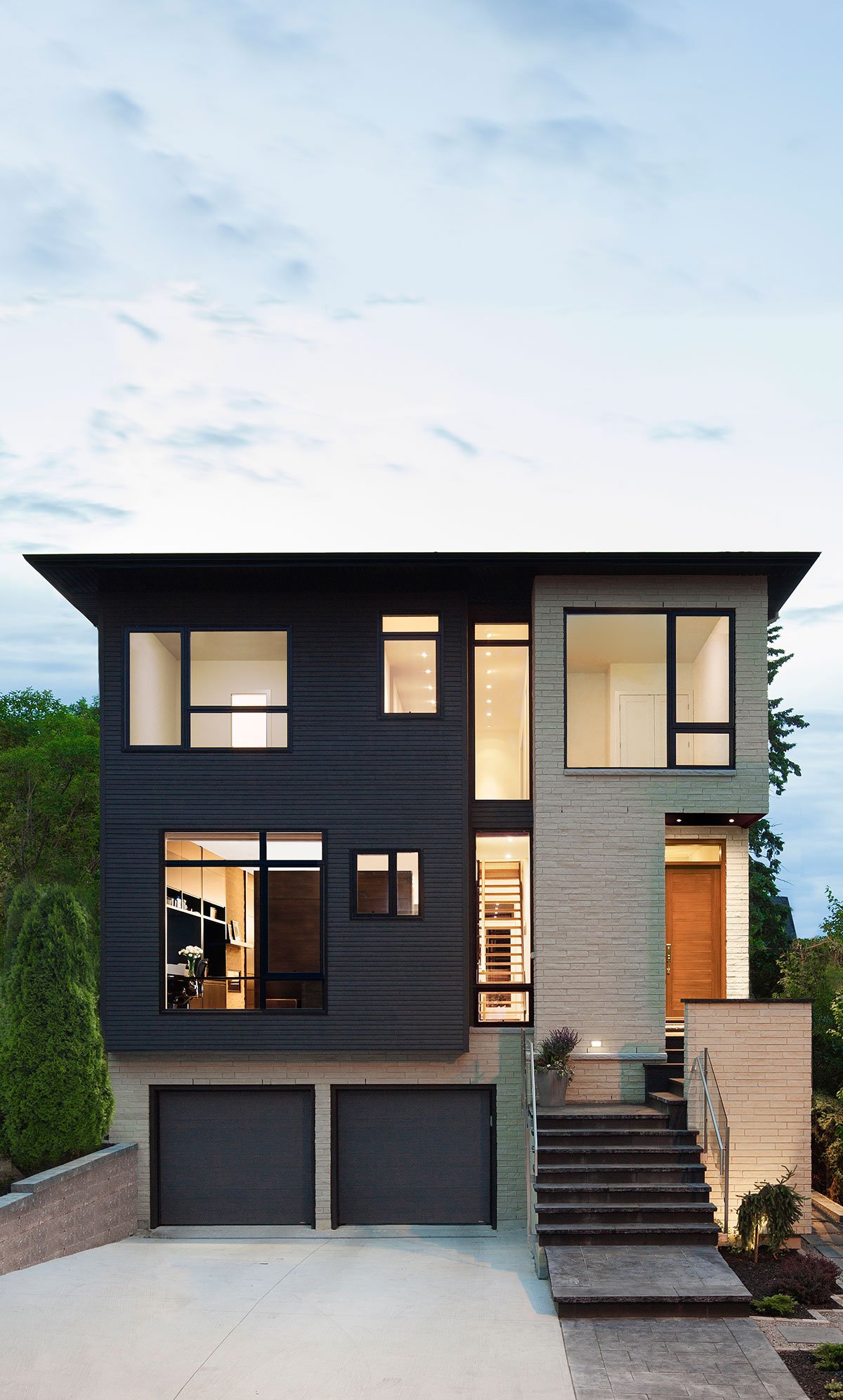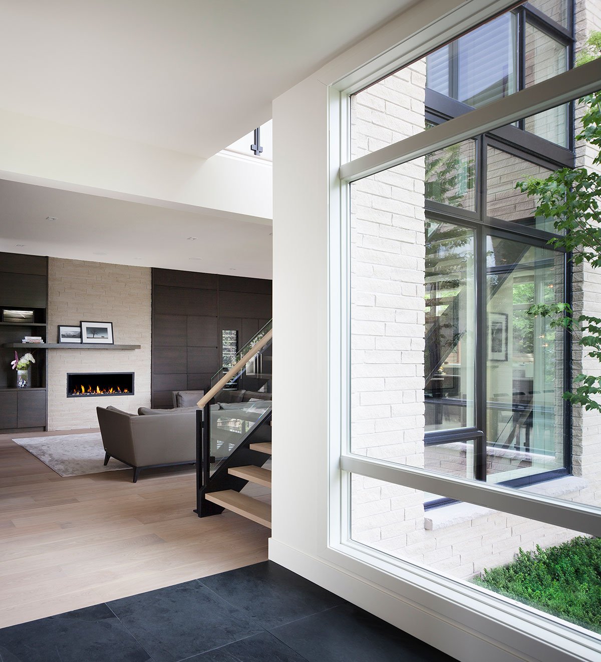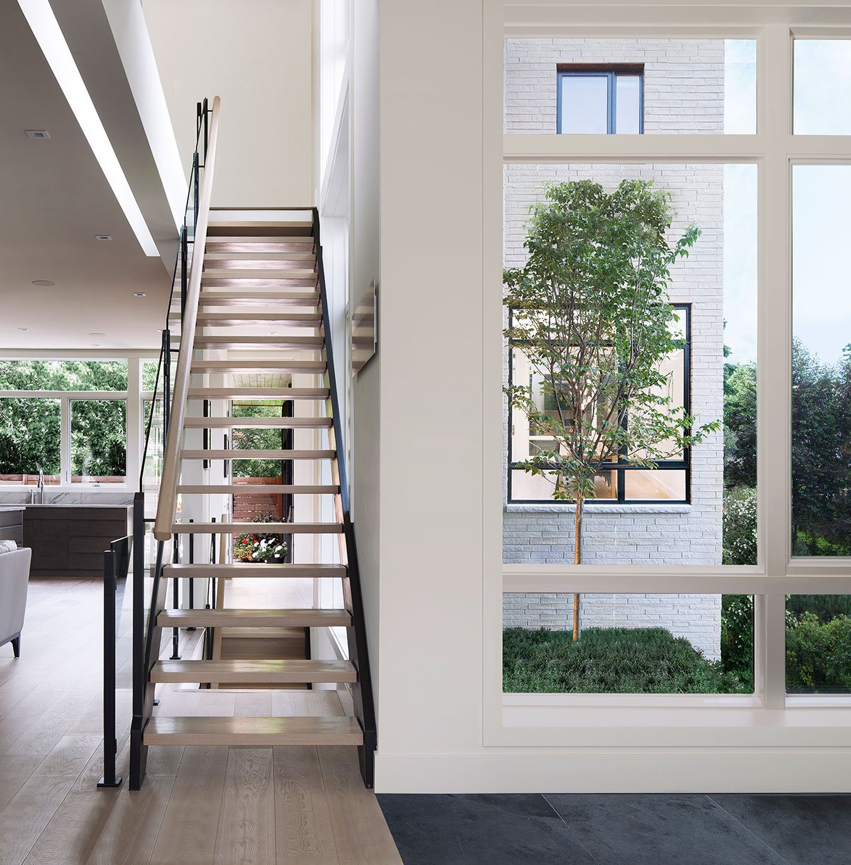 A sense of privacy is created, despite the numerous and large windows that were achieved, as the main living areas begin a full-flight above street level; a slate and glass entry stair and walkway create a generous arrival point for visitors. Likewise, the entry stair/foyer volume is clad in white masonry in order to visually advance and welcome visitors towards the walkway (while the volume housing primary living spaces as well as the garage below is clad in black clapboard in order to recede from the sidewalk). A continuous visual and spatial gap cuts entirely through the home between the light and dark volumes; an open-riser stair is inserted into that void, set against the backdrop of the garden courtyard.