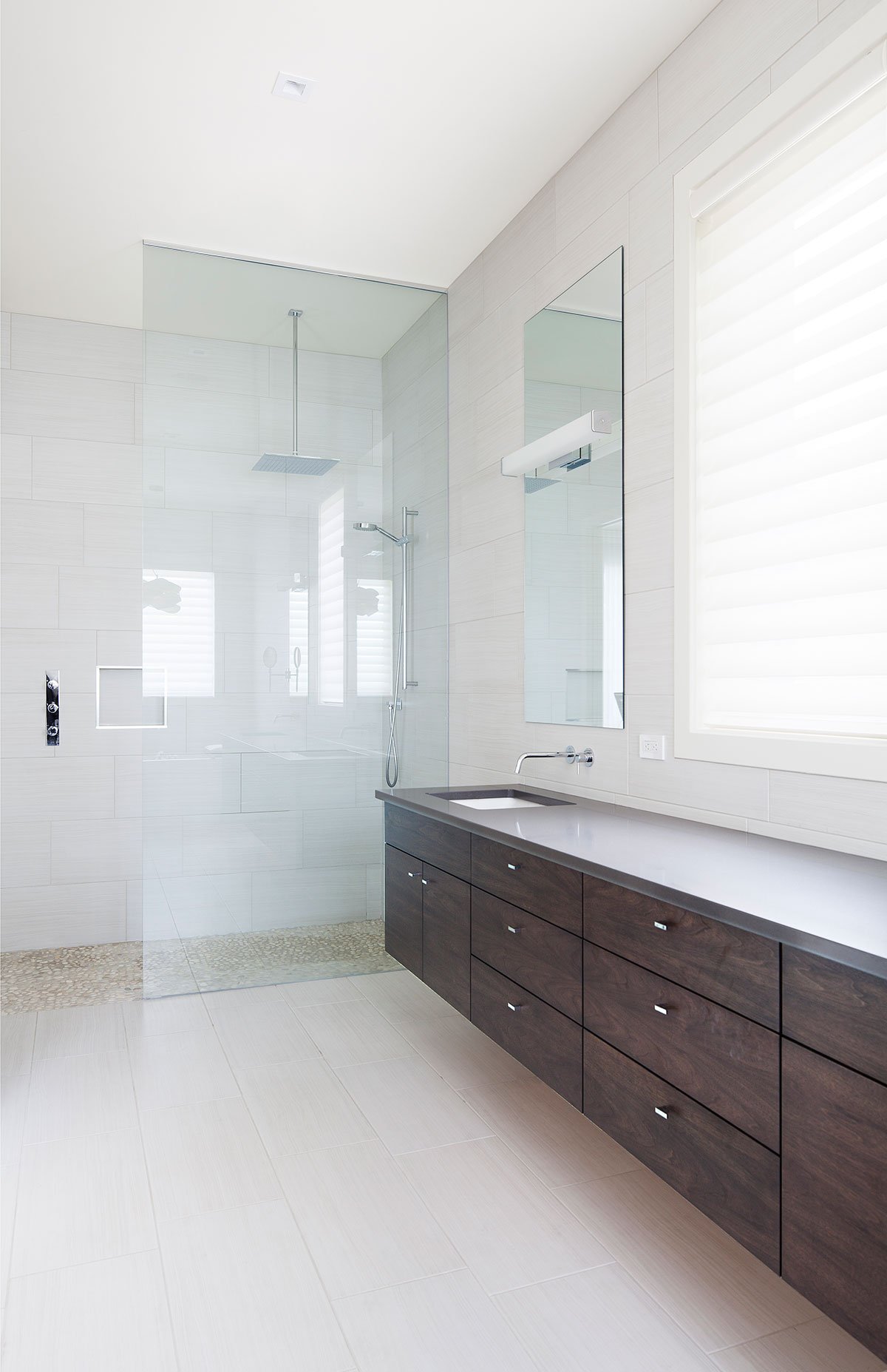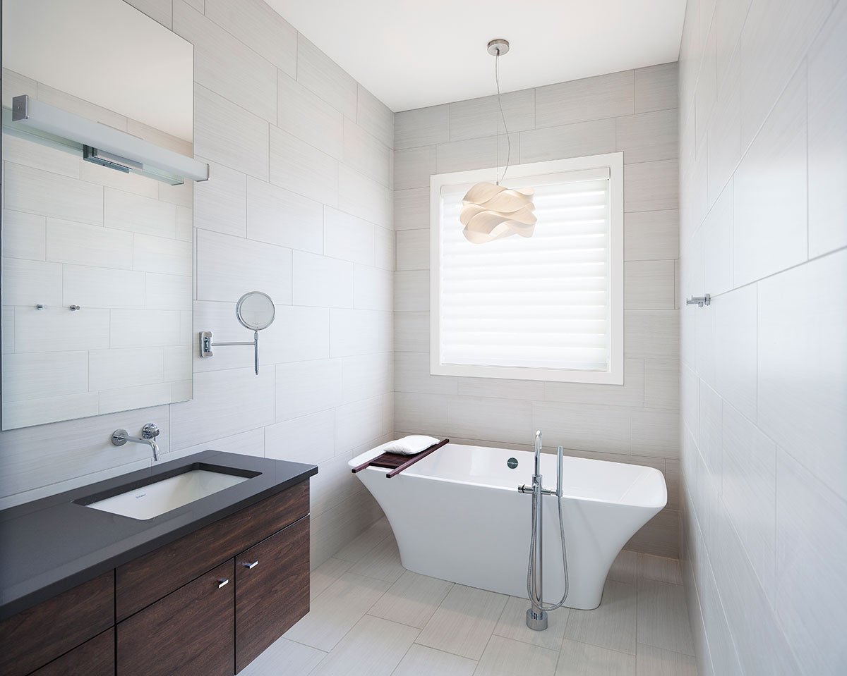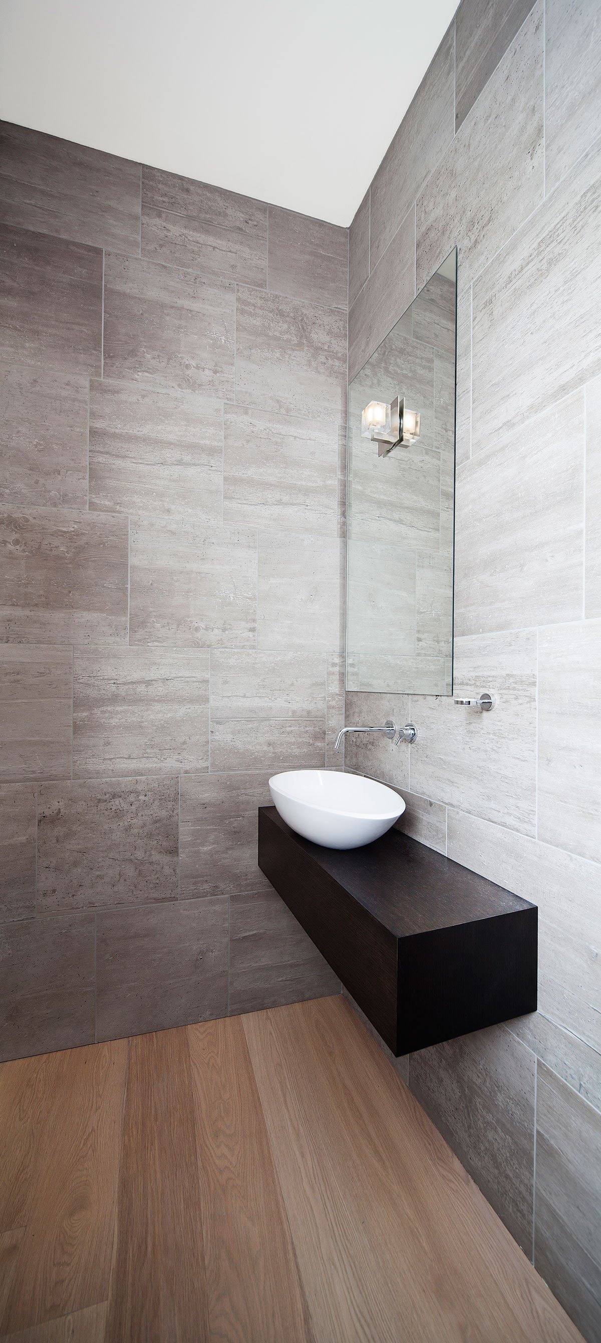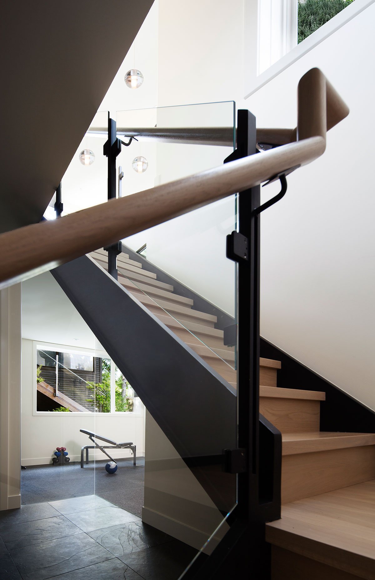 A sense of privacy is created, despite the numerous and large windows that were achieved, as the main living areas begin a full-flight above street level; a slate and glass entry stair and walkway create a generous arrival point for visitors. Likewise, the entry stair/foyer volume is clad in white masonry in order to visually advance and welcome visitors towards the walkway (while the volume housing primary living spaces as well as the garage below is clad in black clapboard in order to recede from the sidewalk). A continuous visual and spatial gap cuts entirely through the home between the light and dark volumes; an open-riser stair is inserted into that void, set against the backdrop of the garden courtyard.