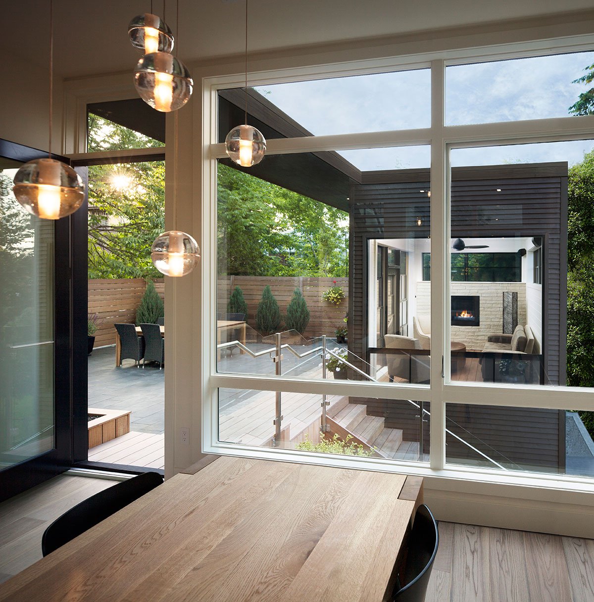 Design Response: The design of the home revolves around a two storey, light-filled raised garden courtyard. The garden takes a “bite” out of the tight, permissible building area, however it allows for an extensive amount of glass that otherwise, due to restrictive building code requirements, would not be possible. The courtyard’s lot-line side remains open, while its three interior sides are filled with windows and bring natural light into the heart of the home on both living floors. The courtyard is filled with ornamental plantings, and while it serves as a “daylight-magnet,” it also serves as a lush, visual focus for each of the primary living spaces of the home.