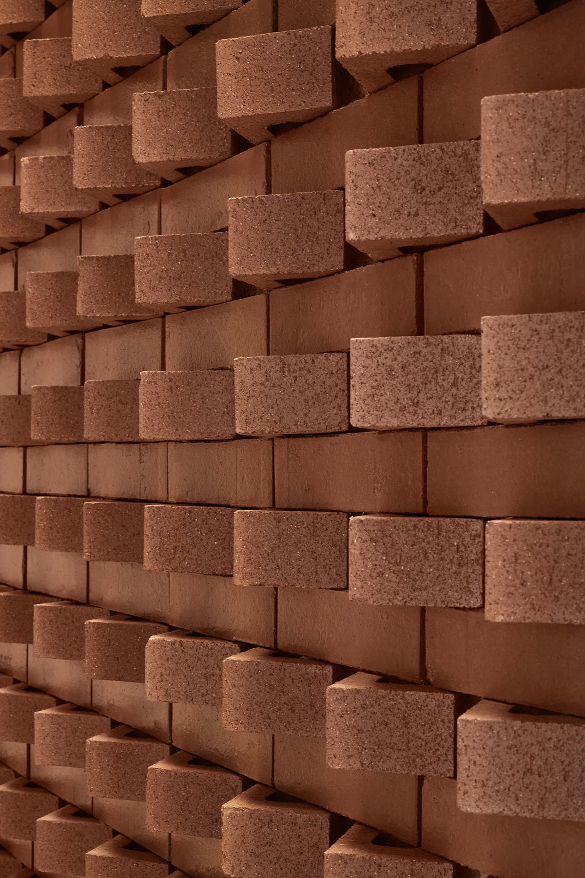 This includes the use of faux plaster wall finishes, made by a local artisan, which brings a soft, fragile, and imperfect visual quality, juxtaposed with terracotta brick walls that contrast in color, porosity, and material hardness. The use of furniture with organic lines, and the omnipresence of sober, natural-looking textiles, also contrasts with other cooler elements, such as the champagne-colored metal reception desk.