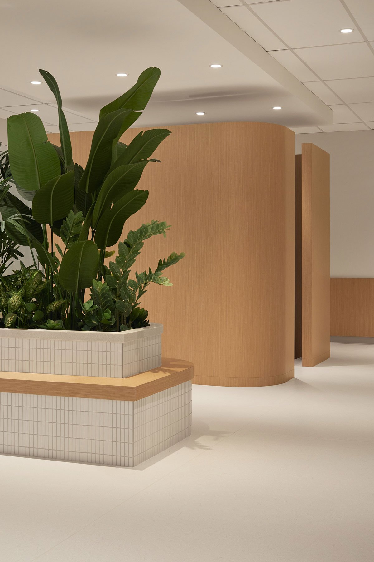“There was a strong desire to push ideas beyond what we’ve seen in healthcare design in recent years, with the goal of making patients feel immediately comfortable,” said Gatline Artis, owner of Espace 313. “This was achieved with the use of a soft, earthy color palette, curved volumes, and natural materials that echo a residential aesthetic. Vegetation also plays an important role, as it creates a connection to the outdoors and nature, which are well known to induce a sense of relaxation in users.”