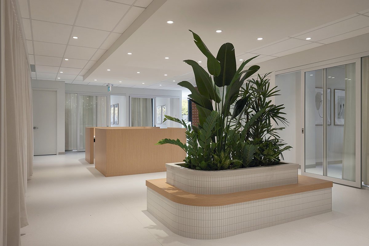 As a result, most of the rooms are not dependent on artificial lighting for daytime illumination, and numerous glazed partitions were installed with the aim of diffusing as much natural light as possible into the heart of the building. In areas where this wasn’t possible, the rooms are lit with soft, warm light, a deliberate choice in stark contrast to the cold, sterile lighting often found in healthcare environments.