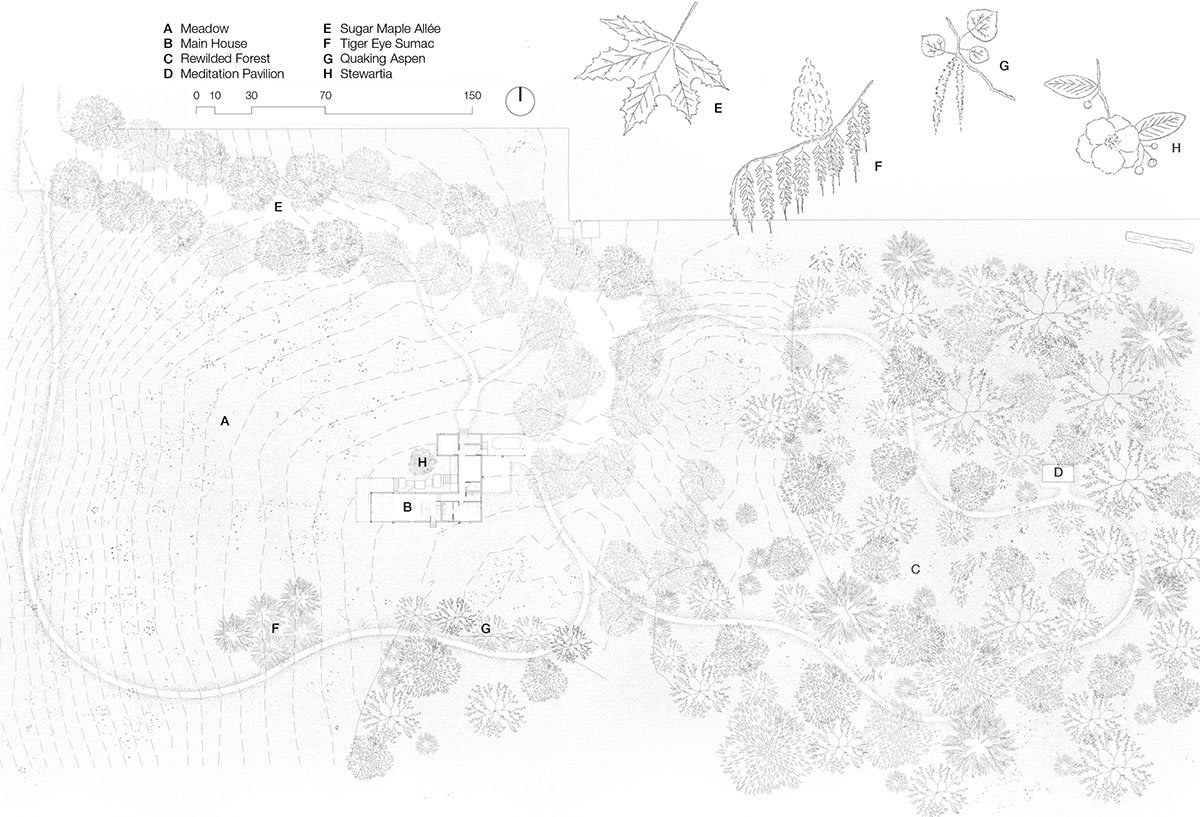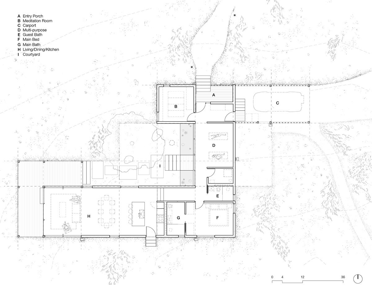 The owners often travel back home to India to partake in meditative retreats. They requested a retreat that could serve as an escape from urban living and as a place for meditative contemplation. The location and design allow the couple, their two sons, cat and dog, to play within the rhythmic sway of the meadow grasses and stunning views.