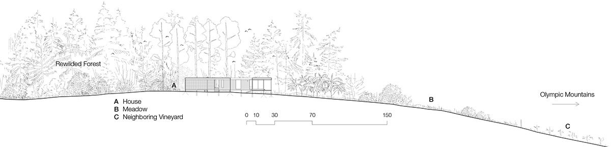 The experience of the house starts at the journey from Seattle. The owners cross the pearlescent waters of the Puget Sound and head into the outlands of rural Whidbey Island. A Sugar Maple tree lined driveway beckons them closer, winding up a steady slope, through meadow vegetation – Blue Oat Grasses, Mexican Feather Grasses, Adagio Maiden Grasses – and summer blooming flowers – Cone Flowers and Flowering Sage. “We wanted to ‘rewild’ the site through landscaping,” says Jody Estes, the lead landscape designer. “It was important to remove invasive species and to create a plan for forest restoration.”