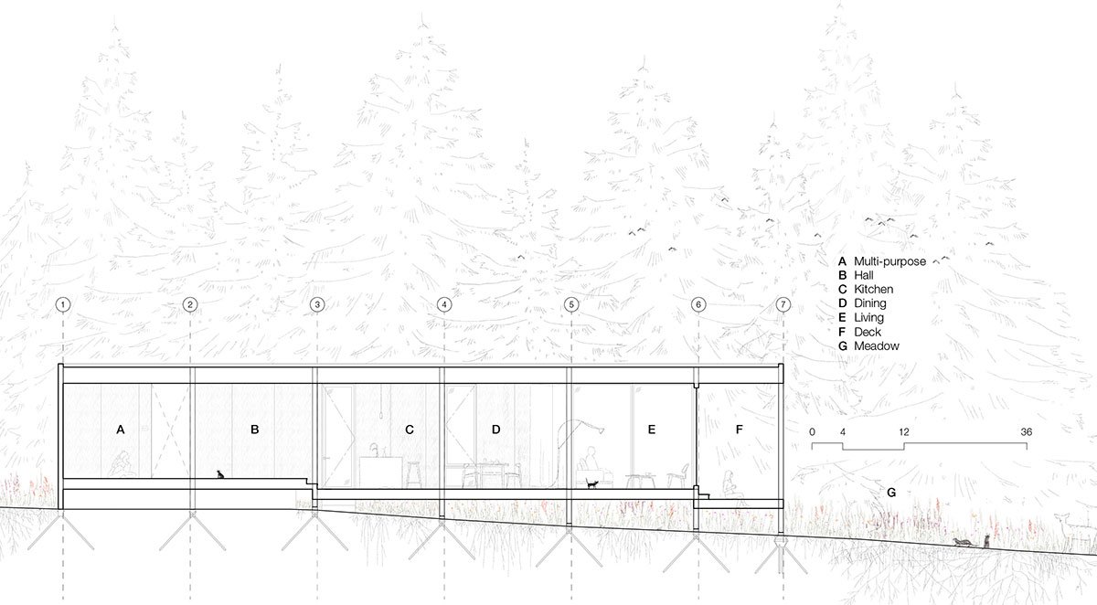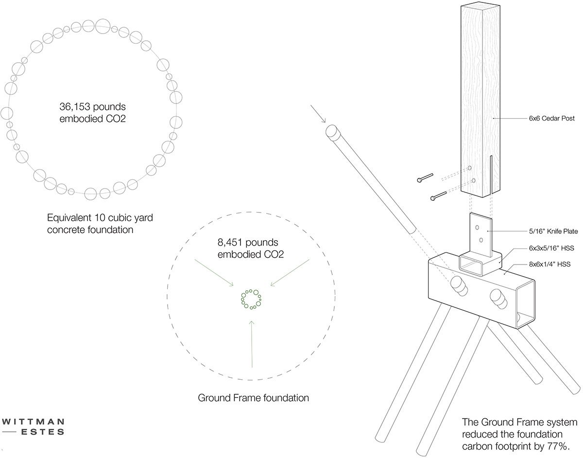 The structural engineering is supported by a Ground Frame foundation system to eliminate using concrete for the foundation of the house. This enabled the architects to avoid the use of concrete altogether and accentuate a light touch on the landscape. The Ground Frame foundation reduces the carbon footprint by 77% relative to the equivalent concrete foundation. The micro pile technology acts like roots for the house, anchoring it to the ground both structurally and visually.
