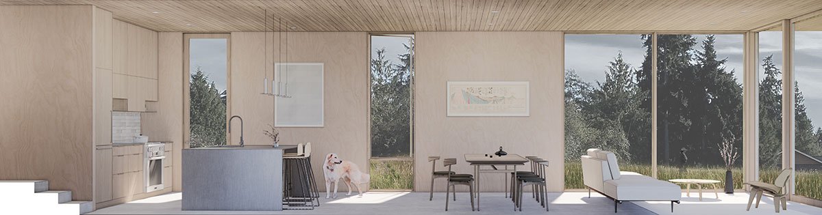 The house consists of two bedrooms, two bathrooms, a multi-purpose room, and a living room and kitchen for communal activities. The transparency of the house invites residents to spend time together and enjoy the rural background, while the house’s location on the highest part of the lot allows for panoramic views of surrounding Useless Bay and the Olympic Mountains. During the warmer seasons, the owners can also enjoy a generous west facing deck.