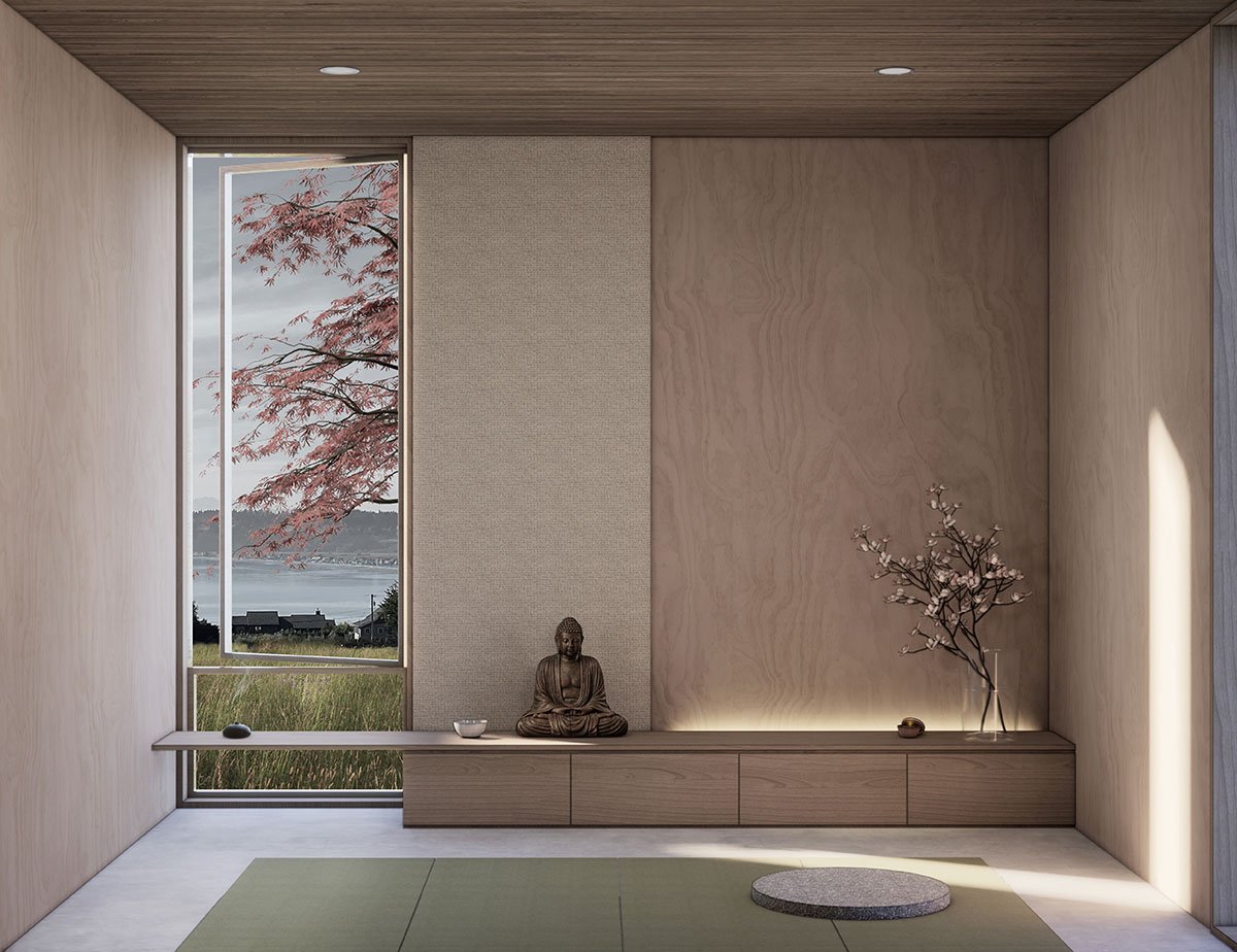 The Whidbey Uparati house is defined by its simple structure and connection to the landscape. A porch is screened by wood slats for a more intimate and protected entry. A west deck highlights the views to Useless Bay. A courtyard features a reflecting pool, sheltered by a Stewartia tree. A walking path that meanders around the perimeter of the five-acre lot. In a future phase, the walking path will lead into the forest to a meditation pavilion.