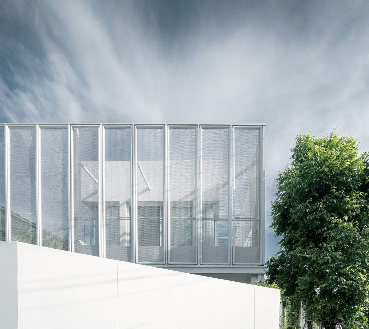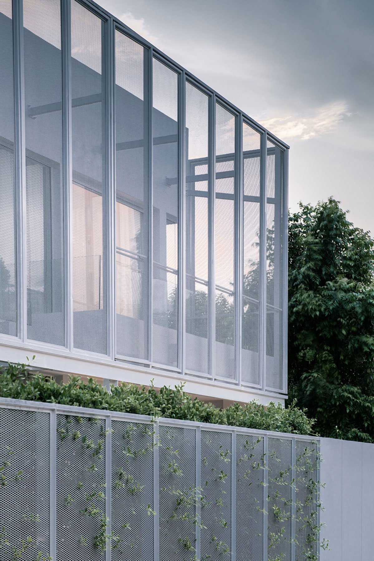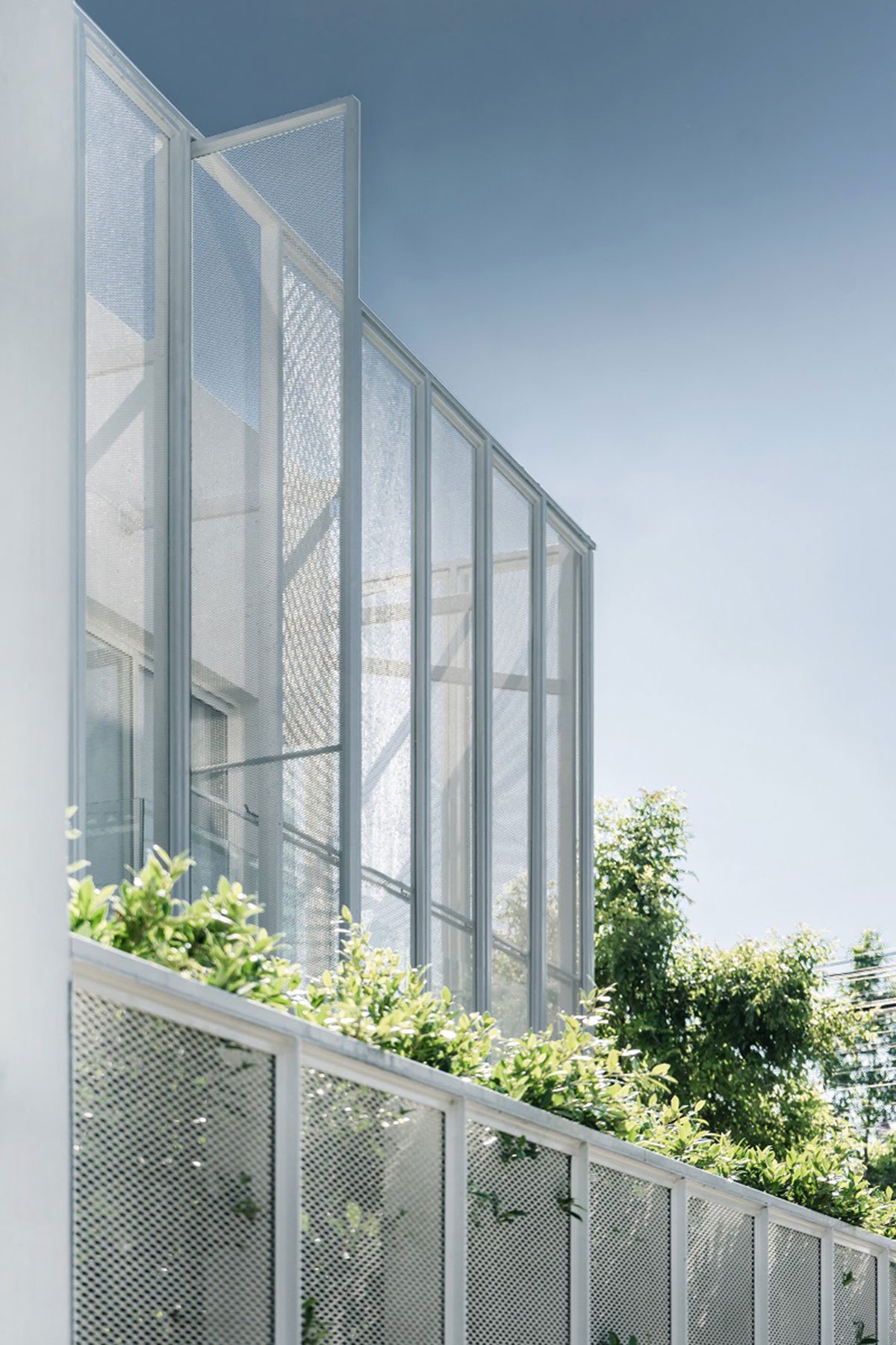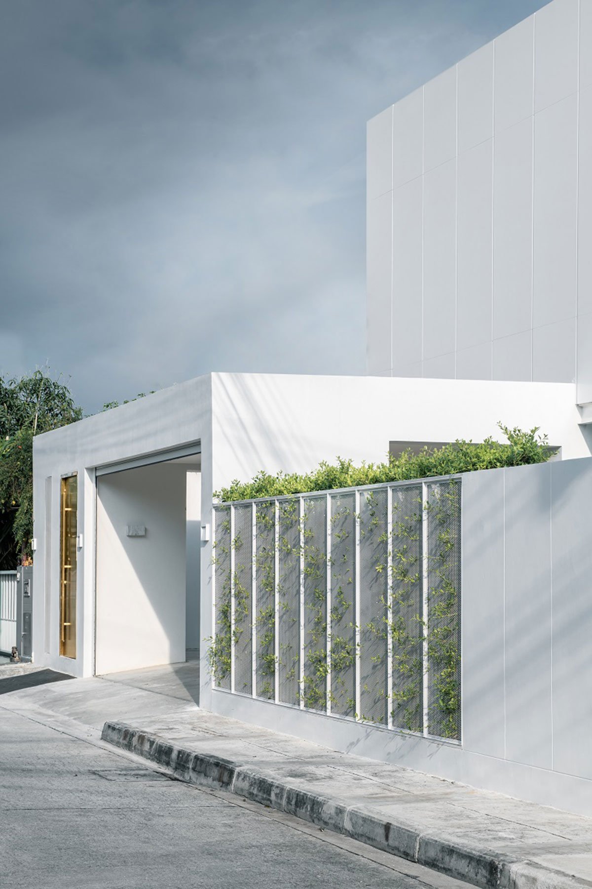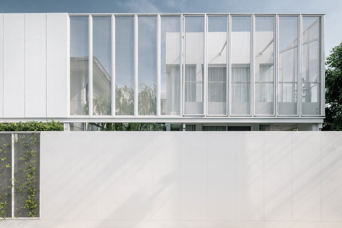 Excerpt: White Canvas, designed by ACA Architects & Kirin Design & Living, is a modern minimalist white plane with a composition of textures: steel mesh, aluminum composite panels, and simple paint finish wall. By combining two buildings with the horizontal façade on the 2nd floor and the fence on the ground floor, the center courtyard was created between the buildings making visual linkage to the landscape design and using as a main function terrace for the family.
