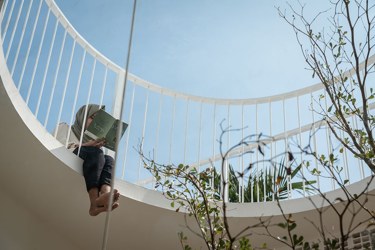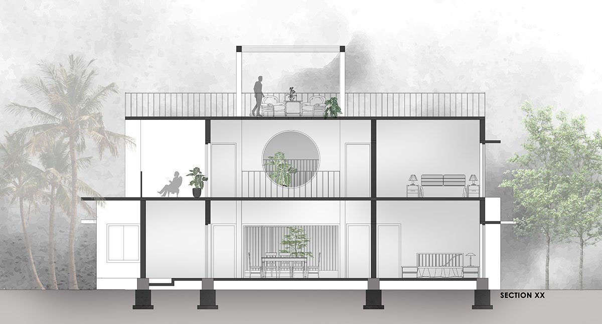 For example, placing all the semi-private and informal spaces such as the living room, the office and the library in the south ensures a reduction in the use of artificial sources of light since sunlight is abundantly available during conventional working hours. Another fine example of how the natural context has been optimized is the open plan concept with a central atrium flanked by rooms on all sides, creating a natural vacuum and pressure system, which induces a centralized cross ventilation mechanism, once again omitting the need for mechanized air-cooling systems.