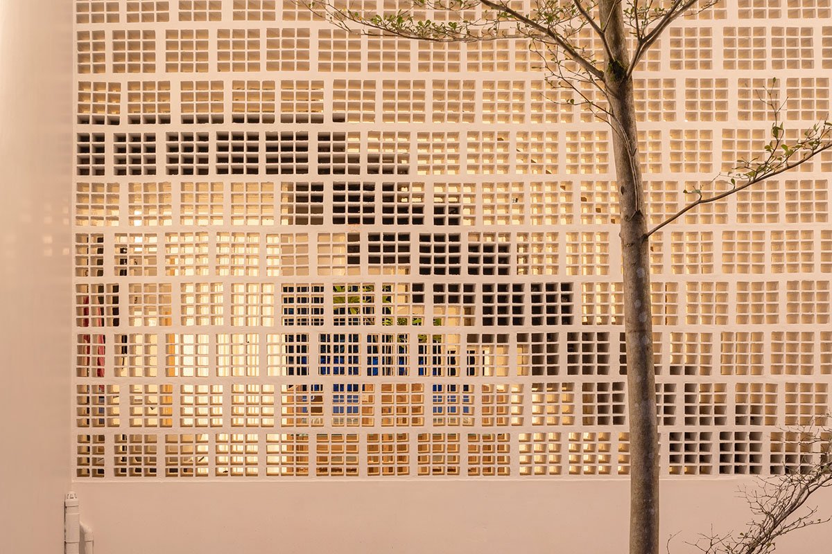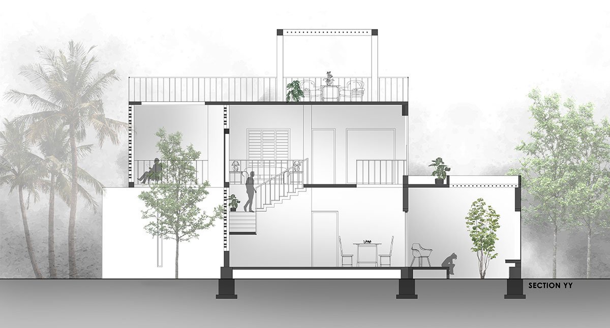 Additionally, due to the overall recessed and relief massing, there is constant and unhindered air circulation between the exterior and the interiors of the building. A double-heighted atrium over the dining space is backed by the staircase, which is accompanied by existing onsite vegetation, and delicately enclosed by a white brickwork Jaali. The atrium rises to end in a skylight at the terrace level, which doubles as an entertainment or breakout space for informal gatherings. This becomes the central focal point on entry into the house.