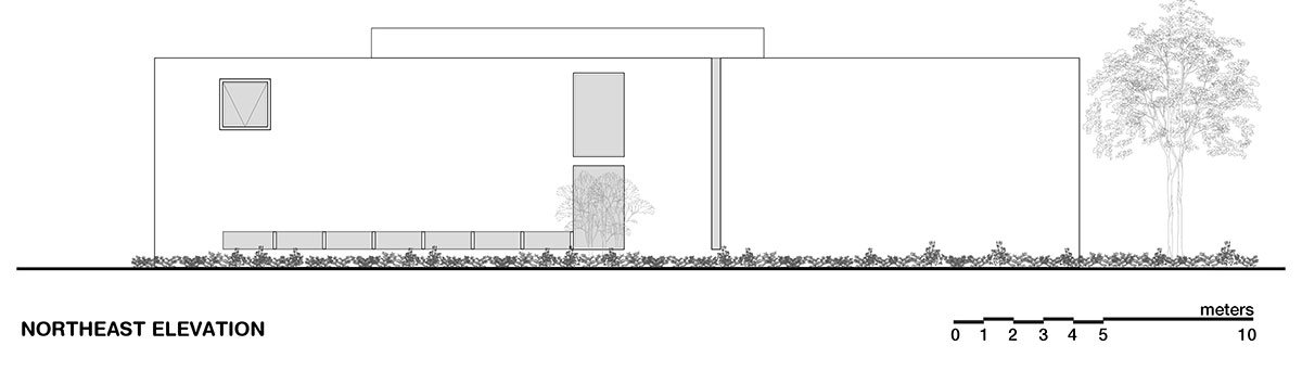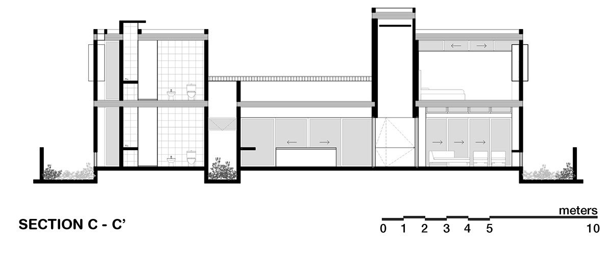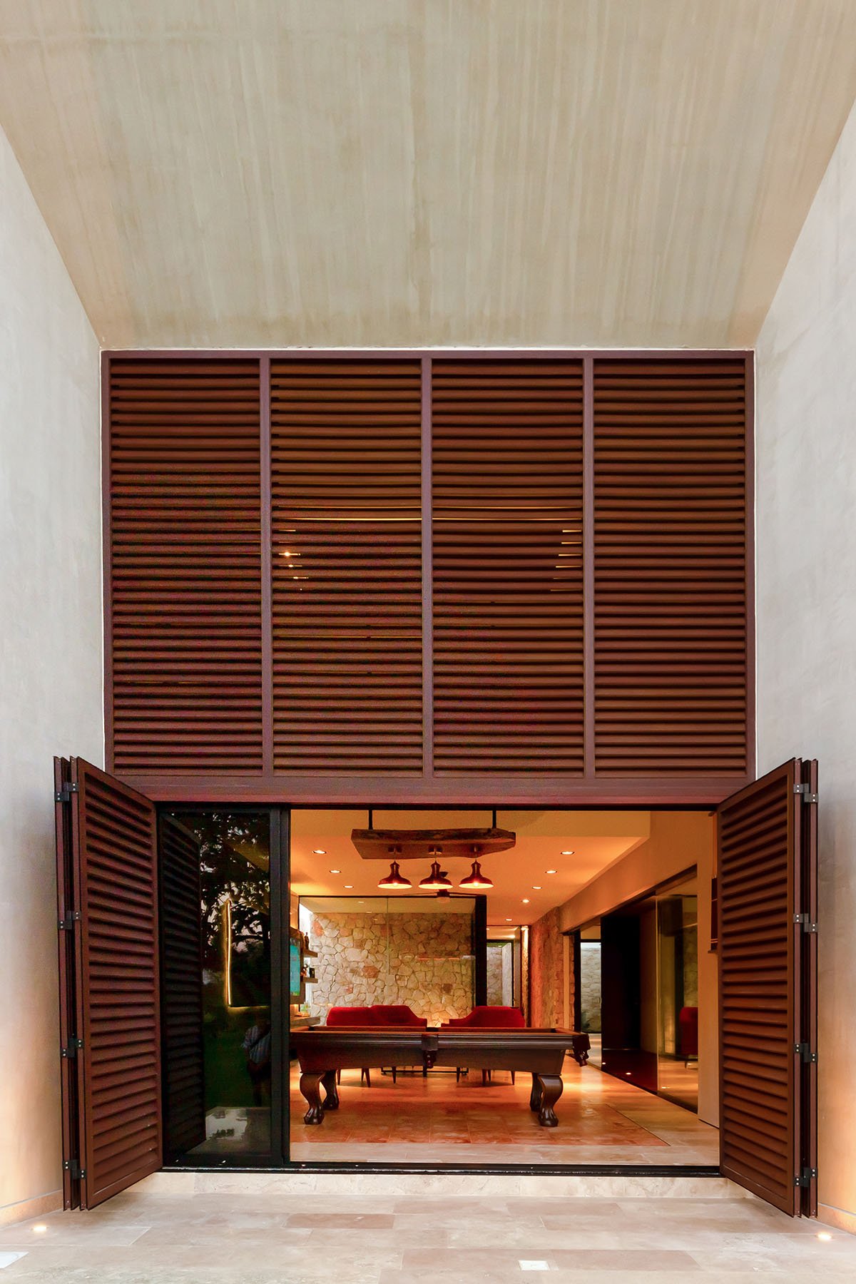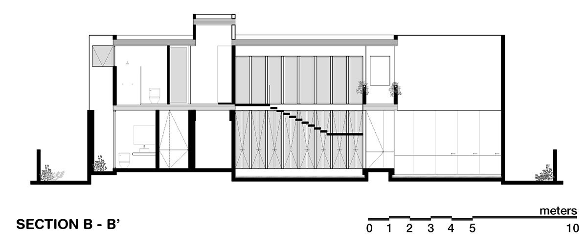 Every space is distinguished by its privacy control and permeability towards the exterior, as such as the office that is divided in two parts: one on the outdoors and one on the indoors and their interaction is perceived as dependents one from another since the foliage and the tectonic of the residence allow (if wanted) to get rid of the splitting between them, promoting constant ventilation and controlled sunlight. Texture management responds to the location’s permeability, quarry stone on the volumes enclosing terraces, walls with sandblasted concrete finishes and wood and glass membranes as versatile control elements.