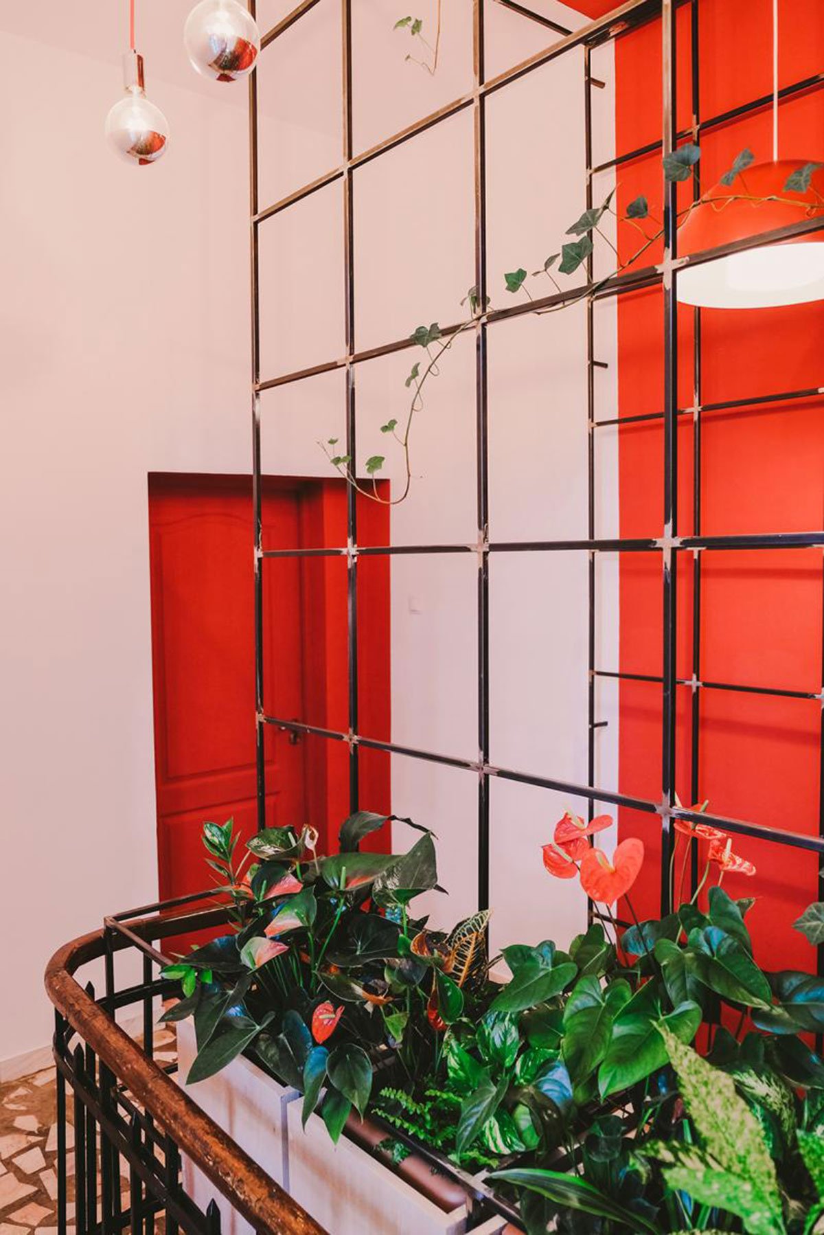 To integrate into the story of the house this transient space of the staircase, a metal installation, like a grid of pixels, delineated the space. Over time, the grid will transform and will get covered by hanging plants.