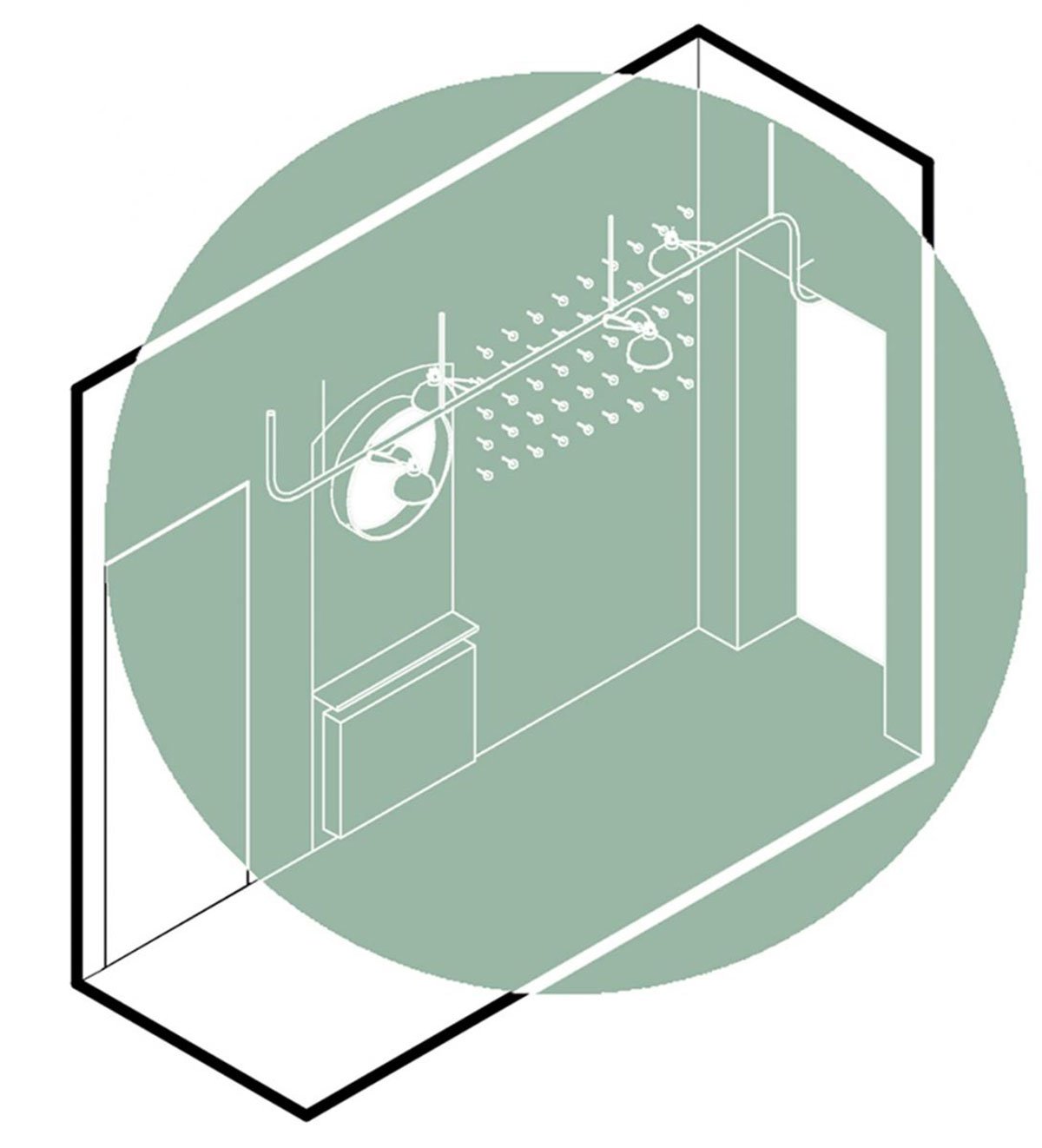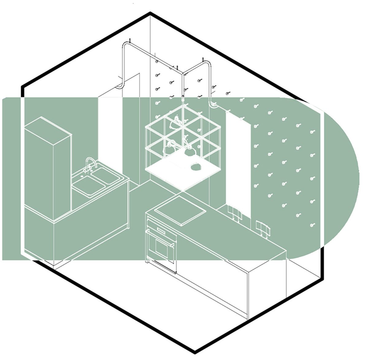 The kitchen remains the main meeting place and functions as a reception for the visitors and a polarizing space for the team. The space’s centrepiece is a multifunctional 3D metal grid of “pixels” (cup holder and light fixture), the highlight of the narrative thread.