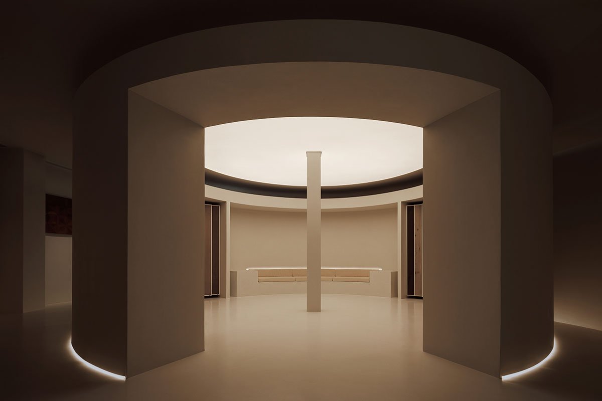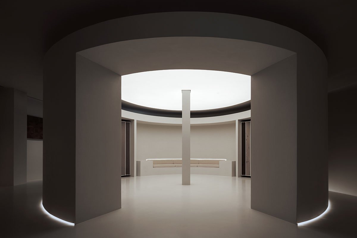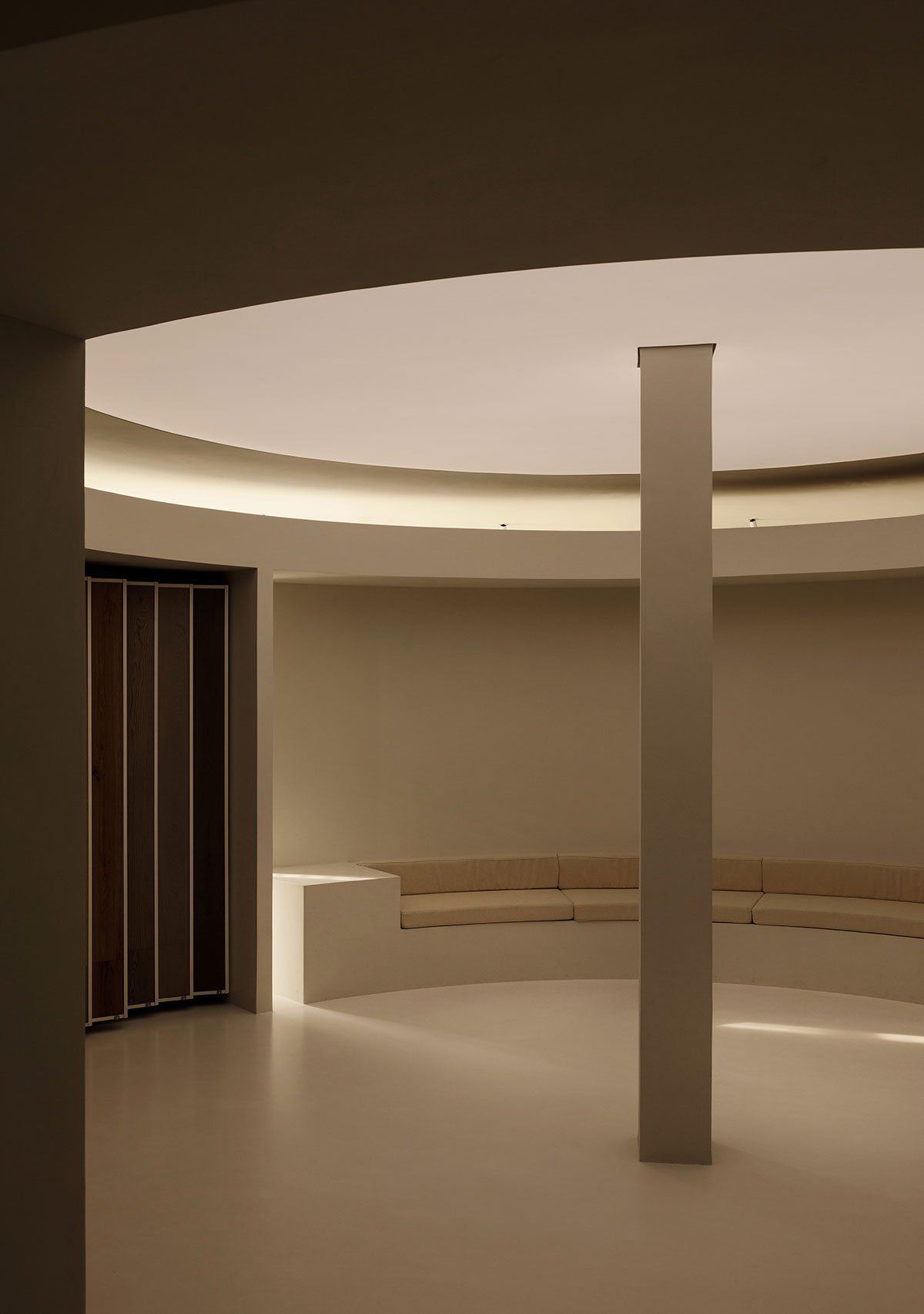 The atrium area, as the core of the product display, creates an absolute spiritual space through its central enlarged column design and the layout of curved display panels. Combined with the skylight effect simulated by the overhead lighting film, it allows visitors to deeply experience the sacredness and tranquility that the space evokes, enhancing their focus and appreciation of the environment.