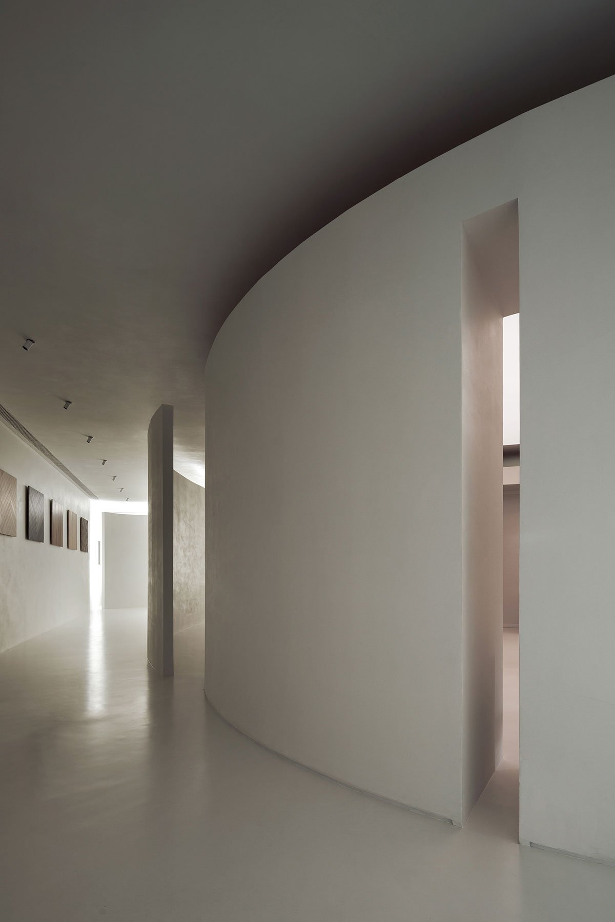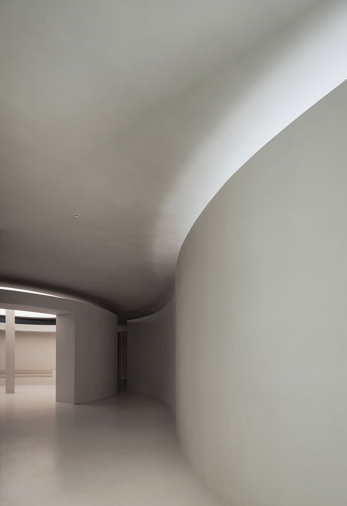 The main flow in the space is designed around the newly inserted volume. The entrance, formed by two curved walls, visually obscures the view of the entire space, preventing a complete view at once. Visitors are guided by the light and the movement line of the outer circle, leading them gradually into the exhibition hall. Suddenly, a spacious and bright circular exhibition hall reveals itself, creating a sense of openness and clarity.